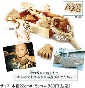 入浴の時間が楽しくなる木のおもちゃ「おふろでちゃぷちゃぷ」。魚、イカ、タコなどは木材として評価が高い高知県産のヒノキを使用。お風呂に浮かべるとほのかにヒノキの香りが広がり、心と体をリラックスさせてくれます。セットに含まれている網を使って魚すくいを楽しめ、お風呂が苦手なお子様でも遊び感覚で入浴を楽しんでもらえるはずです。無塗装なのでお子様が口にしても安心です。