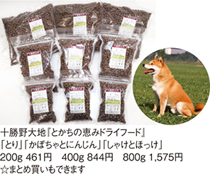 ペットの健康を第一に考え、安心して食べられる素材だけでつくった『とかちの恵みドライフード』。原材料は全て北海道十勝産。小麦は低温で製粉処理しているため、通常の小麦粉に比べ栄養分を失うことなく、ミネラルや風味もそのまま。ポリアミン、植物繊維がたっぷり含まれている。酸化防止剤、着色料などの添加物は使用していない。種類は、手羽はしを入れた「とり」、「かぼちゃとにんじん」、「しゃけとほっけ」の3タイプがある。小型犬から大型犬まで、かわいいペットのために愛情たっぷりのメニューを準備してあげよう。
