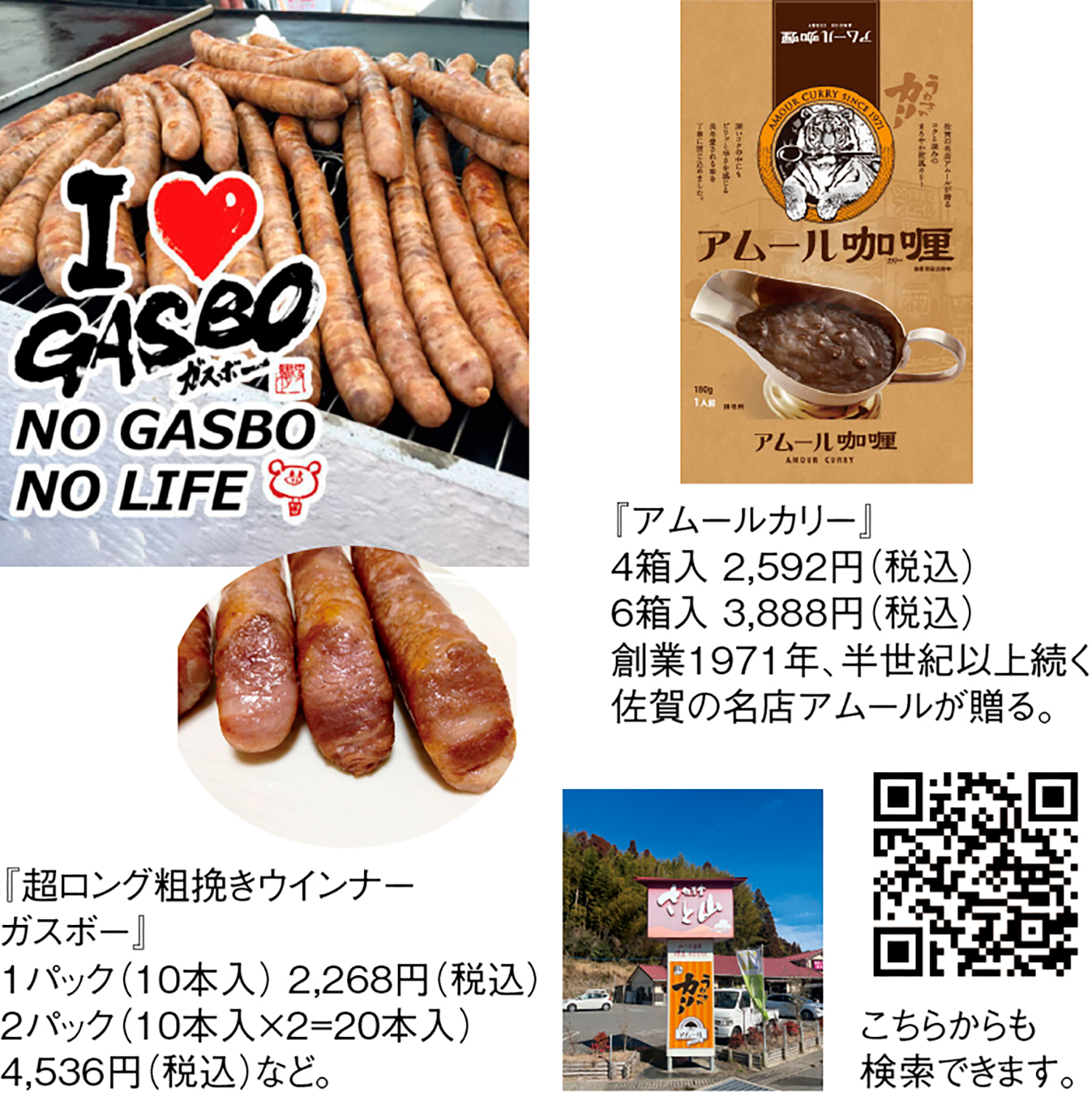 佐賀県三瀬村にある『旬菜舎さと山』では、地元の野菜や特産品、お土産、工芸品などを販売。今では新しい佐賀の名物として注目を集め、『旬菜舎さと山』のレストランでもいただける佐賀の名店の『アムールカリー』はまろやか欧風カリー。深いコクの中にもピリッと辛さを感じる長年愛される味。佐賀バルーンフェスティバルで「ガス屋が作ったウインナー」として大好評だった超ロング粗挽きウインナー『ガスボー』は、オンライショップでも販売している。ぜひ佐賀の名産を取り寄せてみよう。