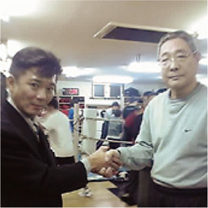 沼田ボクシングジムの後援会長に就任した際の岡村社長(左)と沼田会長(右)