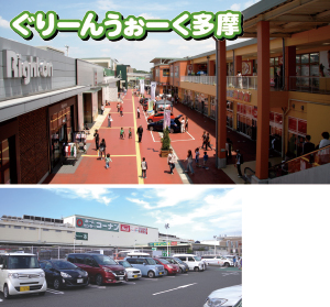 多摩ニュータウン開発で増加した人口を集客するために作られただけあって、巨大な複合施設『ぐりーんうぉーく多摩』。ホームセンターコーナン・ヤマダ電機・ニトリなどの単独店。ファッション棟には、コナカ、ABC MART、ダイソーなどレストラン棟にはミスター・ドーナツ・マクドナルドなど。ほかに衣料、靴。スポーツなどのお店がずらり。また駅からのバスの車内アナウンスで下車の停留所が分かることや授乳室が2箇所ある気配りは、利用者には嬉しい。