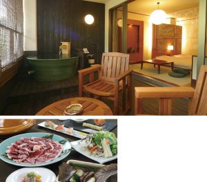 ったりと」との想いに相応しい『里山の休日 京都・烟河』。希望に応じて部屋が選べ、露天風呂付もある。古来より湯治湯とされていた自然豊かな里山の名湯を心ゆくまで堪能できる。四季の移ろい感が満喫できる『岩風呂露天風呂』も人気。料理も自家農園や近隣農家の野菜を使用しているので新鮮そのもの。『里山ランチバイキング』も好評。冬には、『丹波ぼたん鍋コース』でジビエ料理も味わえる。