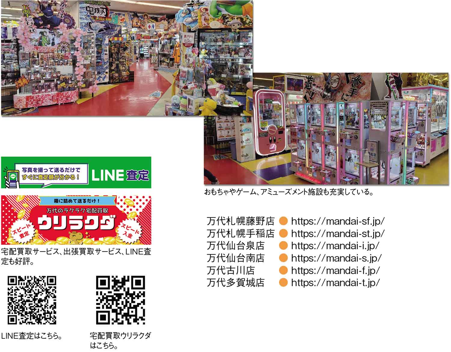 宮城県と北海道を中心にリサイクルショップを運営している『株式会社万代』。大型エンターテイメント × アミューズメントをテーマに宮城県で4店舗、北海道で2店舗展開中。バラエティ豊かな商品が各店舗に並ぶ。おもちゃやゲーム、古着、ブランド品など、新商品も日々続々と入荷中。お目当ての商品が見つかること間違いなしだ。オンラインショップも展開中で、楽天市場やヤフオク、amazonなどで購入できる。また、販売だけでなく買取も充実。売りたい商品を箱に詰めて送るだけの宅配買取サービスや出張買取サービス、写真を撮って送るだけで査定額が分かるLINE査定など店頭買取以外に様々な方法で査定・買取を行ってくれる。家に眠る意外な一品が思わぬ価値を生むかもしれない。同社では、ほかにもブランドなどを中心として買取専門店、農機具専門店、ゲームセンターも運営している。また、2021年7〜8月には、福島県いわき市、北海道十勝地方に『万代』の新店舗がオープンする予定だ。