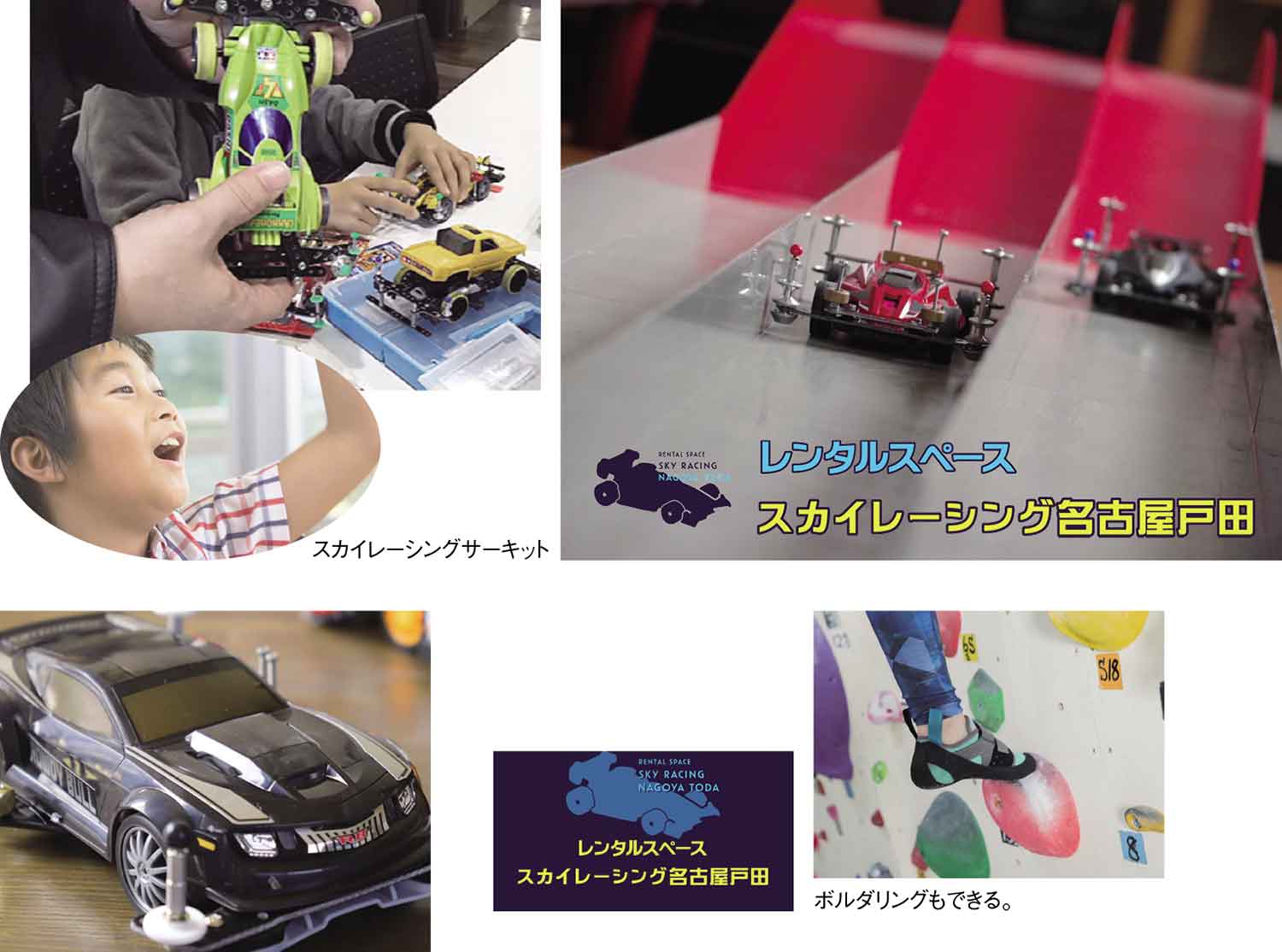 様々な趣味が楽しめる『スカイレーシング名古屋戸田』の『貸しスペース』が人気だ。メインは自慢のミニカーを思う存分走らせることができるレーシングコース。イタリアのナルドサーキットをモチーフにしており、木工職人が木やアクリルなどの材料を用いて製作。イスに座ると頭上をミニカーがを走る、スカイレーシングコースは迫力満点。ボルダリング設備は、高さ3・2mのコースと高さ9・6mのコースがあり、ワイヤーウインチで安全確保してあるので、二人一組で一人がスイッチを操作し、もう一人は初級・上級のボルダリングが楽しめる。また、『貸しスペース』では、大人から子どもまで誰が来ても楽しめる場所で、ピアノとクラシックギターの練習や演奏会、また気のあったバンド仲間で演奏することもできる。大きめの囲炉裏でゆっくりできるスペースも。今後は、鉄道模型などのリクエストがあれば設備に反映させていくこともできる。アクティブな人は大歓迎。みんなのアイデアをもとに一緒に向上していきたいという。