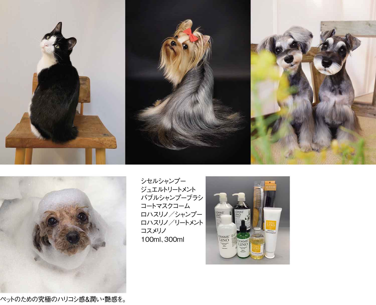 そんな最高レベルのケアを提供してくれる一流トリミングサロンに選ばれているペットのためのシャンプー・トリートメントが『C-CELL'LINO(シセルリノ)シリーズ』。日本の理美容業界トップメーカーの最新技術を応用し、共同開発を行った。被毛の外側からは、キューティクルのダメージを補修して潤いとツヤを。そして内側からは、超高濃度美容液成分が究極のハリとコシを与えてくれる。そのエントリーモデルとして新たに加わったナチュラルテイストの『LOHAS'LLINO(ロハスリノ)』。被毛ケアと同時に『COSME'LINO』のスキンケアシリーズで若々しく健康的な皮膚の維持を。