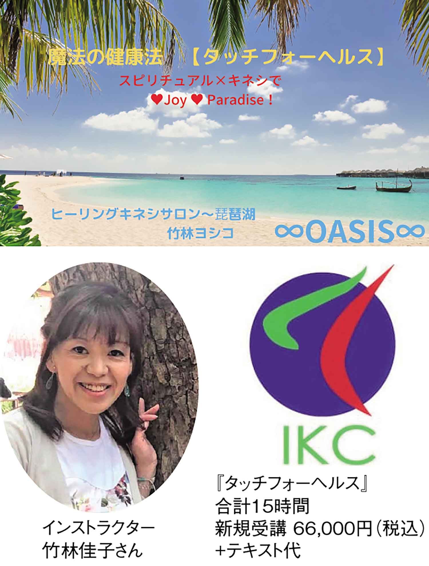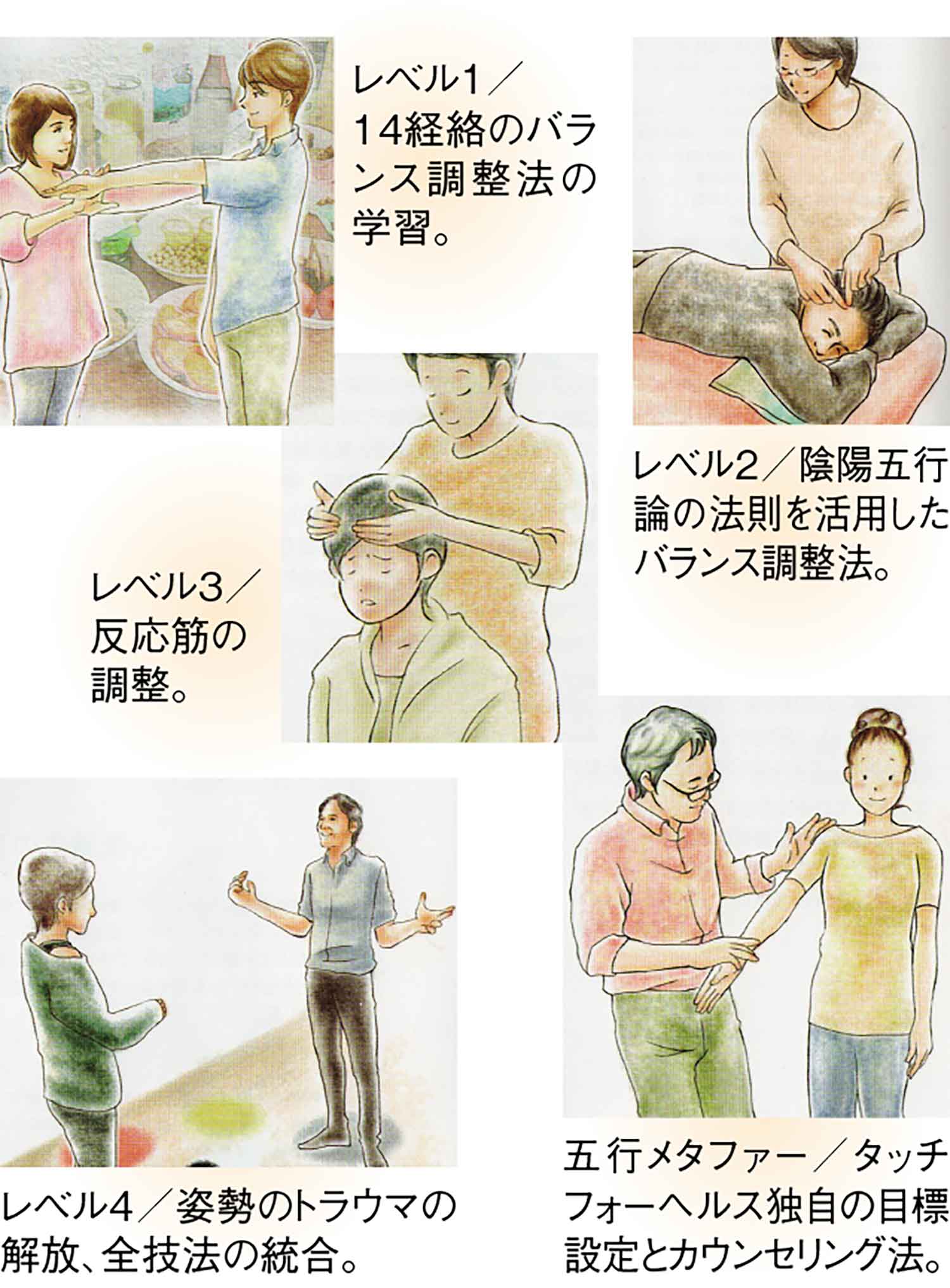 『タッチフォーヘルス』とは、カイロプラクティックから発展したキネシオロジー(心身の関係改善療法)を家庭用医学に組み替えたもので、世界112ヵ国以上に普及している。『日本タッチフォーヘルスキネシオロジー協会』では、分かりやすい五つのテキストとレベルに応じた講座を用意している。健康法とストレス解消法を誰でも短時間で習得することができ、インストラクターへの道もある。