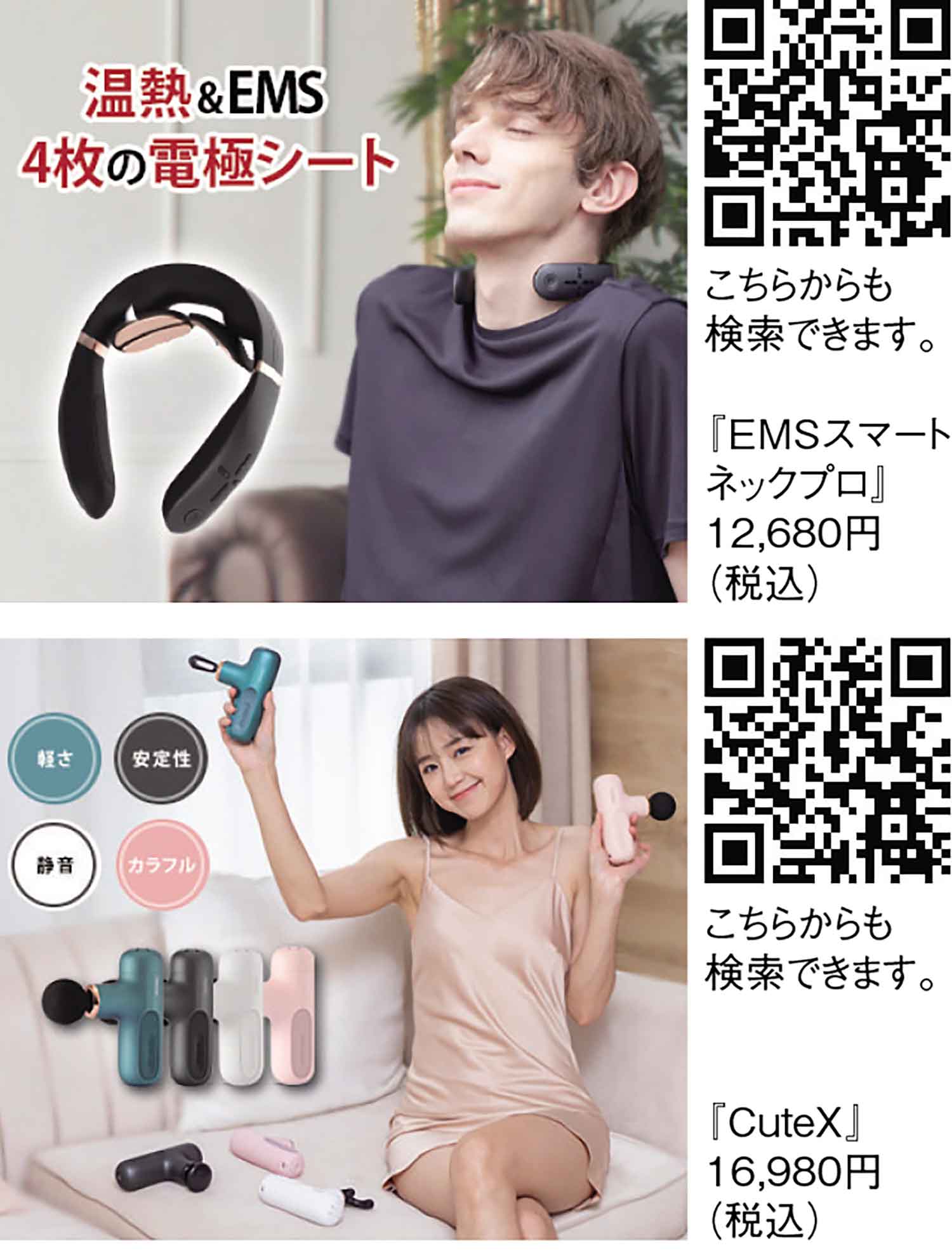 パソコン作業で疲れた首にうれしいコードレスの『EMSスマートネックプロ』は、温熱機能や電気刺激などを自由に組み合わせることで、こわばった筋肉の緊張をやわらげ、リフレッシュさせる。また、すき間時間に使える『CuteX』は、五段階の振動機能が脚のむくみや首、肩をケア。家事の合間やオフィスの休憩時間、寝る前のひと時など、疲れを感じた時に気軽にリラクゼーションタイムを堪能できる。