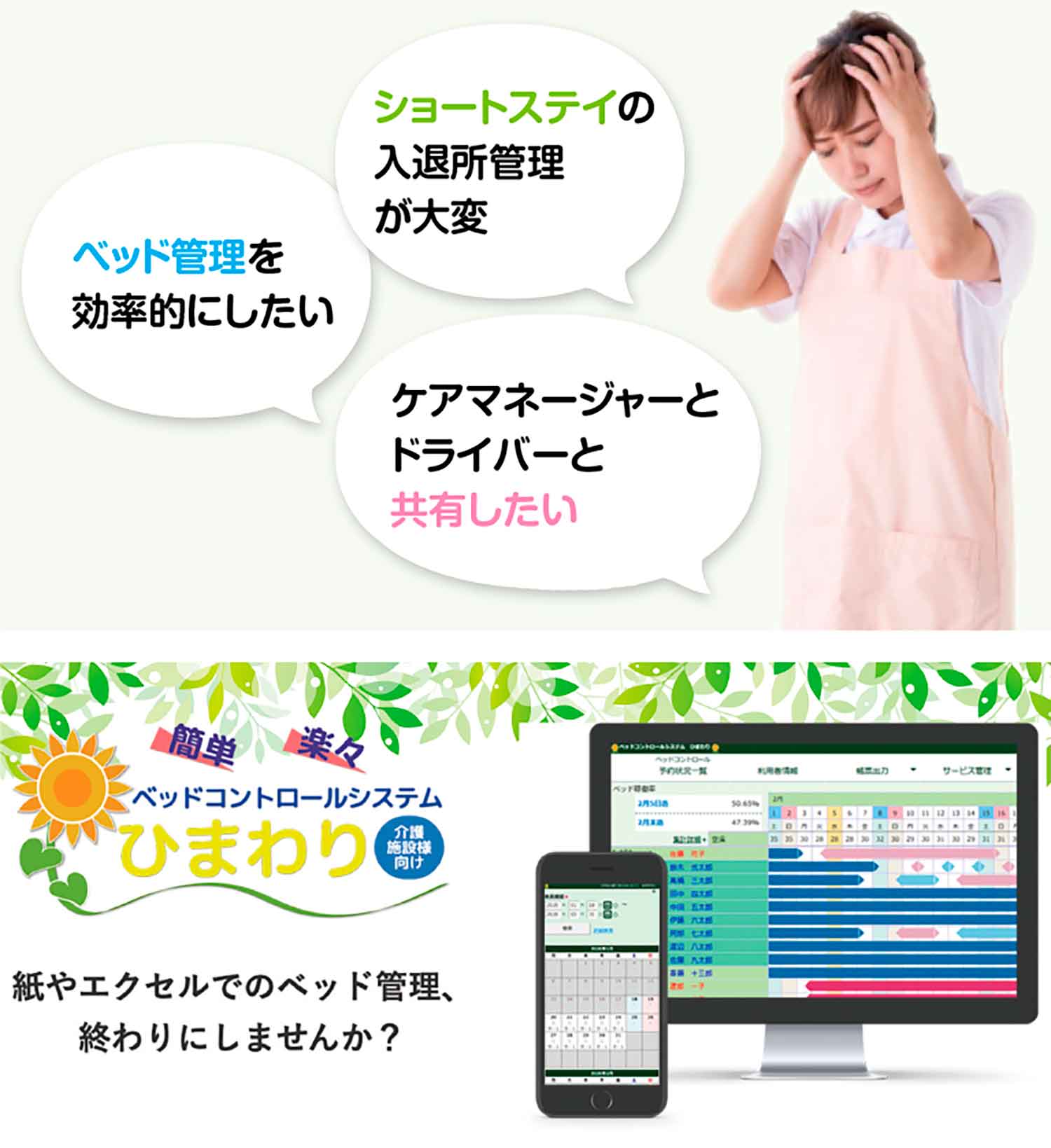 短期入所施設、養護老人ホームなどで介護福祉に携わるスタッフやケアマネジャーが頭を抱えることがらの一つが入所予約。今まで書面やエクセルなどで行っていたものを一元管理で操作できるのが『株式会社ウィズダム』のベッドコントロールシステム『ひまわり』だ。ベッドの稼働状況や入退所管理も一目瞭然。入浴管理や送迎管理もできると喜びの声も多い。