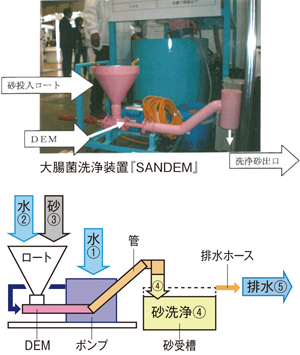 砂場の大腸菌汚染が社会問題になっているが、薬で消毒するのも、加熱消毒も、砂ごと入れ替えるのも大変。そこに登場したのが「水だけで大腸菌が除去できる」という画期的技術。開発したのは「土壌環境プロセス研究所」で、核にあるのが高速水流と汚染土壌を瞬時に混合する『DEM』という特許技術だ。その原理について藤井忠広所長は、「ヌカがついた米はかき回して洗うことでキレイなるが、『DEM』の原理はまさにコレ」と説明。同研究所では、『DEM」を土壌洗浄、濁水処理、大腸菌処理などに応用し、大腸菌洗浄に特化したのが『SANDEM』だ。大腸菌群数の95%除去を実現した。