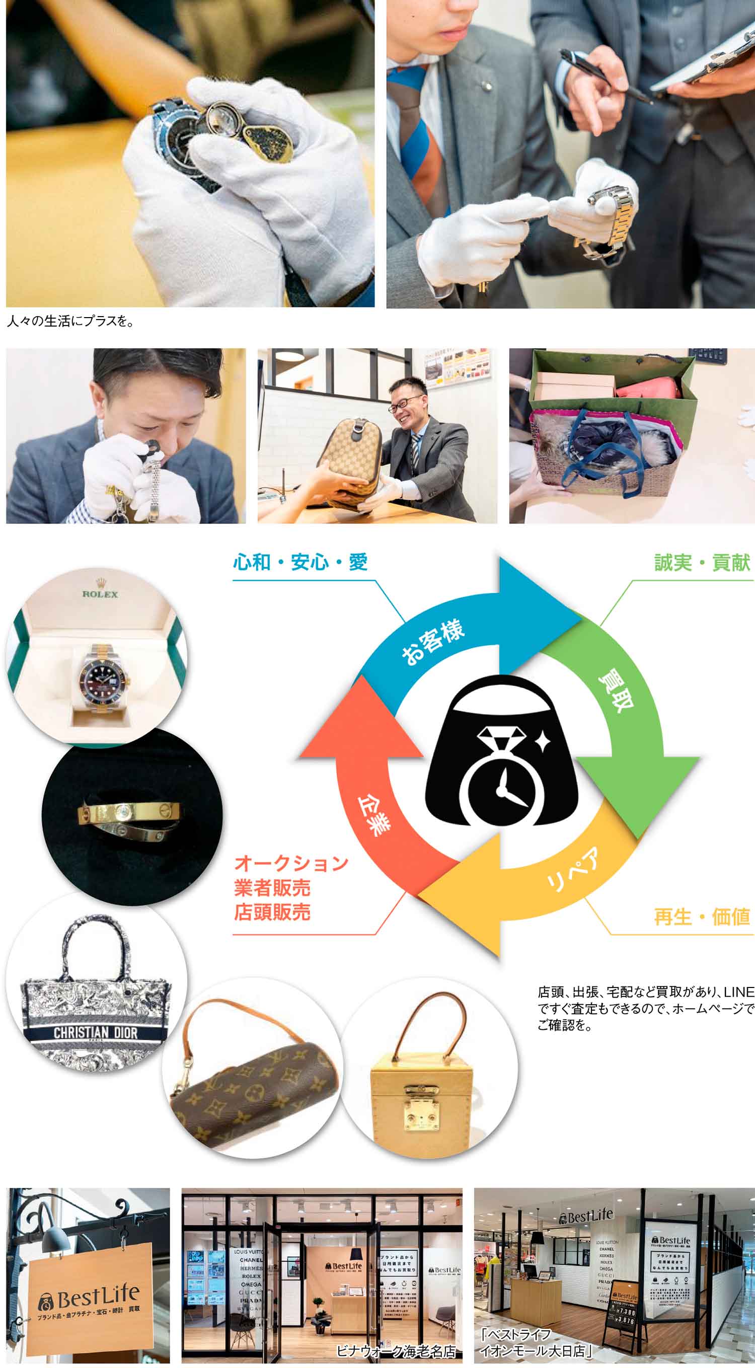 その象徴が、2021年10月に大阪府守口市の駅と直結したショッピングモール内にオープンした「ベストライフ イオンモール大日店」だ。「買い物ついでのリユース」をコンセプトにブランド品から生活雑貨まで幅広く買い取る店舗だが、思わず立ち寄ってみたくなるような清潔感のあるデザインの内装や設備、家族連れや友人、カップル、シニア世代が相談しやすい接客体制、モール内で還元してもらえるキャッシュバック券の配布、査定の待ち時間での〝ついで買い〟の促進など、これまでの古物買取店にはない特長を持つ。