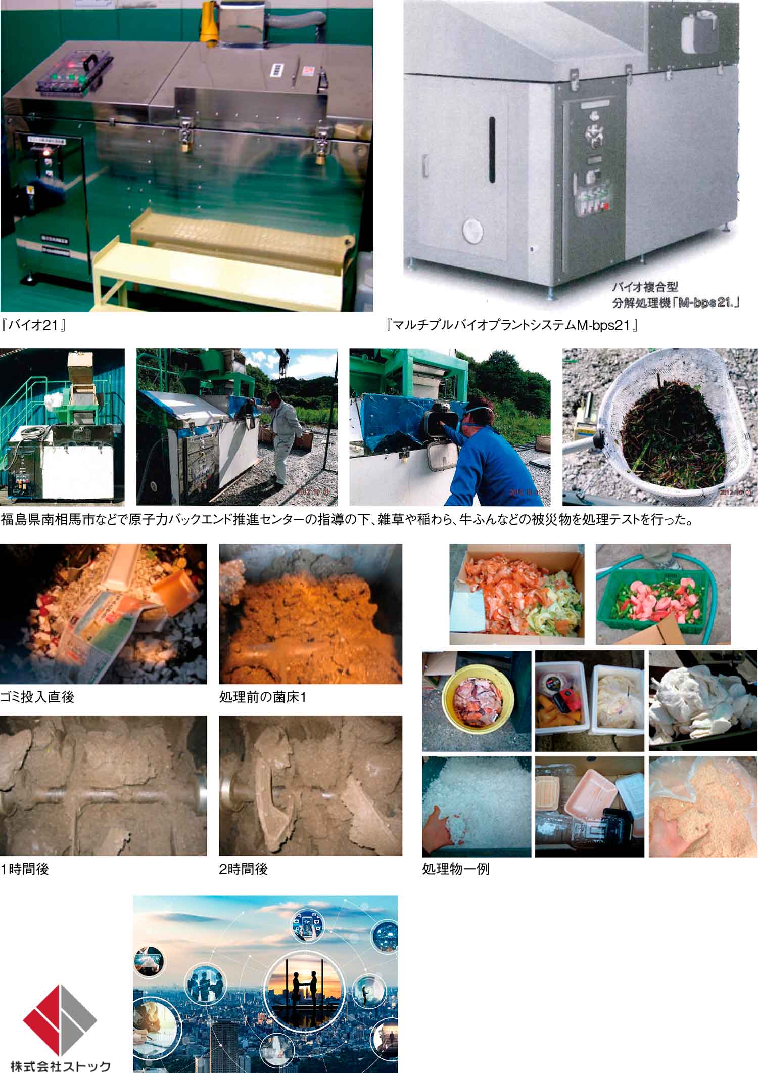 『M-bps21』は、破砕機とバイオ処理機などから成り、稲わらやもみ殻、木片チップ、紙フィルター、紙おむつ、紙製品、パック、発泡スチロールなどを複合微生物群で分解処理するバイオプラントシステム。セラミック製の菌床は多孔質で作られ、無数の孔の中に複合微生物が群集して棲息し、接触した処理物を栄養源として急激に繁殖し、処理物は最終的には水分と炭酸ガスに分解される。特殊触媒で放射性物質の放射能の強さも軽減する。