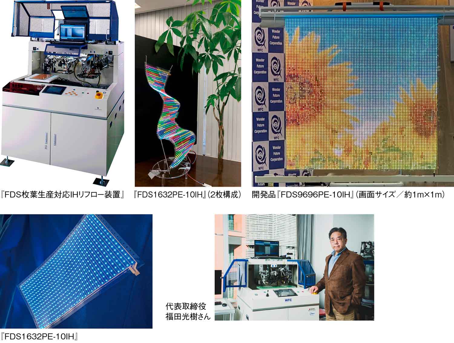 電子表示機器で広告などの情報を発信するデジタルサイネージに進化をもたらす装置が開発された。『株式会社ワンダーフューチャーコーポレーション』の『FDS枚葉生産対応IHリフロー装置』。FDS、はフレキシブル・デジタルサイネージの略で、フィルム基板にLEDを配した世界最薄級、最軽量級、フレキシブルで透過性、異形対応も可能な同社開発のデジタルサイネージ。IH(電磁誘導)を応用した非接触で局所加熱を可能とした技術『IHリフロー』で製作できるのがこの装置だ。『IHリフロー』は、コイルに交流電流を流すことによって発生する磁束線を、プリント基板上の金属端子に当てることで瞬時に熱を発生させ、はんだを溶融してダメージレスに電子部品を実装する技術。これによってフィルム基板の熱ダメージを最小限にLEDを実装でき、FDSの開発につながった。『FDS枚葉生産対応IHリフロー装置』による受託生産にも対応する。