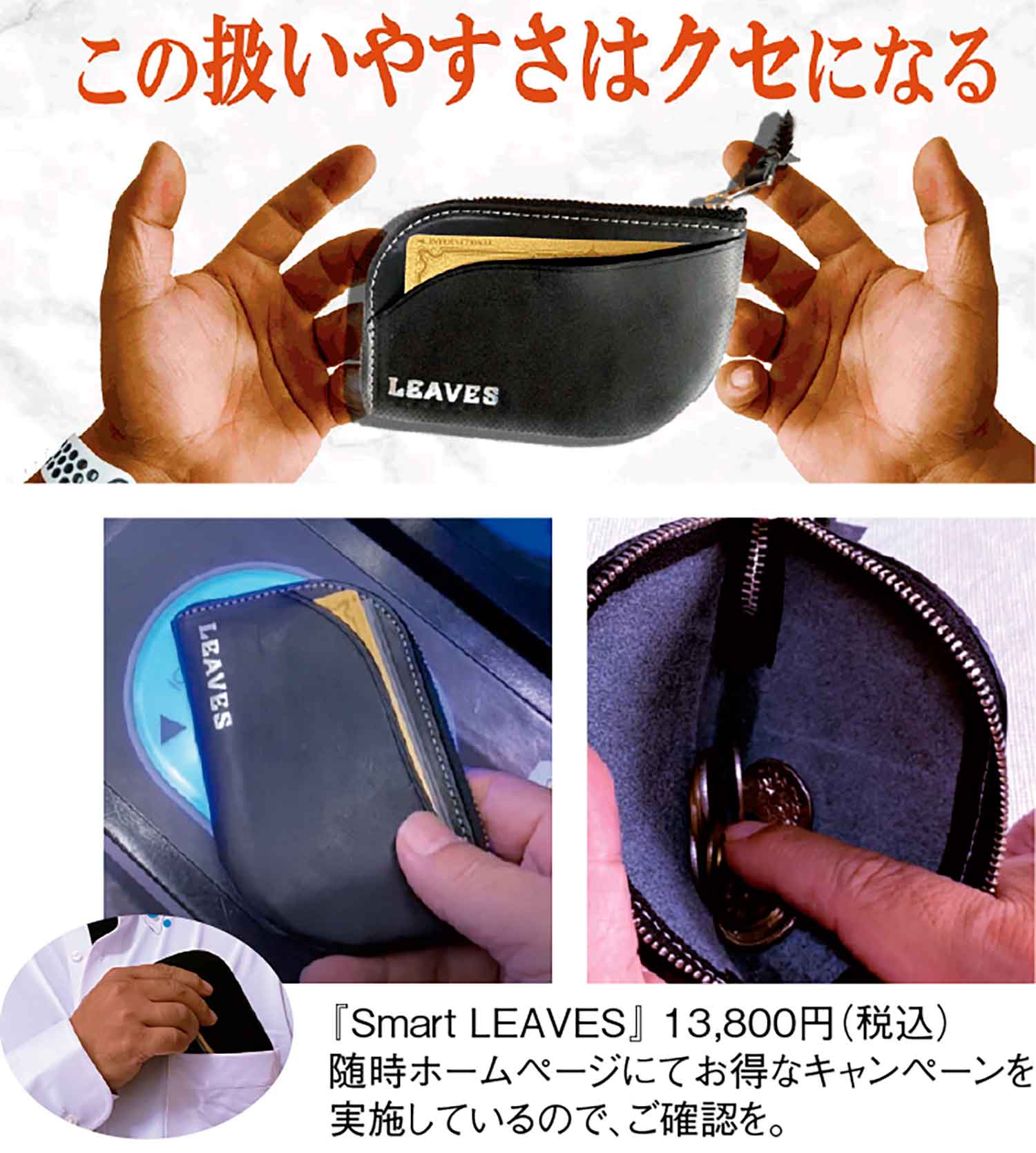 スマートフォンの決済機能は、今や対応するシステムやカードも増え、財布を持たずに外出する人も多いという。しかし、時には現金しか対応していなかったり認証に手間取ったりするケースもまだまだある。『Smart LEAVES』は、葉っぱのような曲線が美しいミニウォレット。わずか32gでポケットにすっぽり。専用ケースは、タッチで決済のできるICカードが二枚入り、そのまま表裏使い分けができる。現金も取り出しやすい。材質は、高品質な栃木レザーで長く使いたくなる。