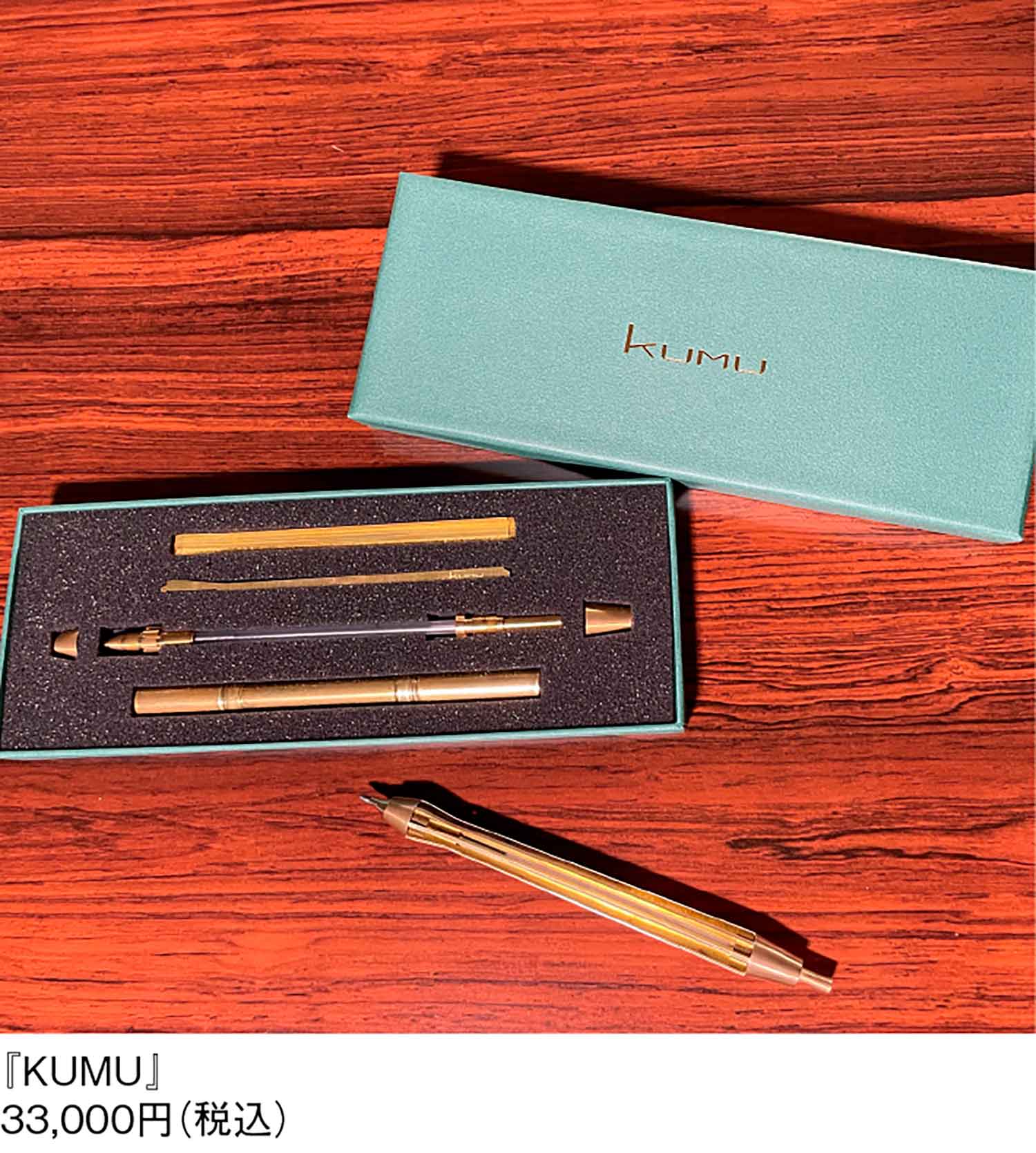 1923年創業の金属文具製造メーカー『恩田金属製作所』。新商品の組立式ボールペン『KUMU』は、素材である真鍮のずっしりとした質感が、重厚な存在感を放っている。そして、使い込むうちに渋い黒味のある色に変化していくのが魅力。自分で組み立てから行い、手に馴染むほどにオンリーワンのペンに育っていく、まさに通好みの一品だ。同モデルのシャープペンシルも販売中。素材の風合いを楽しめるペンをぜひ、お手元に。