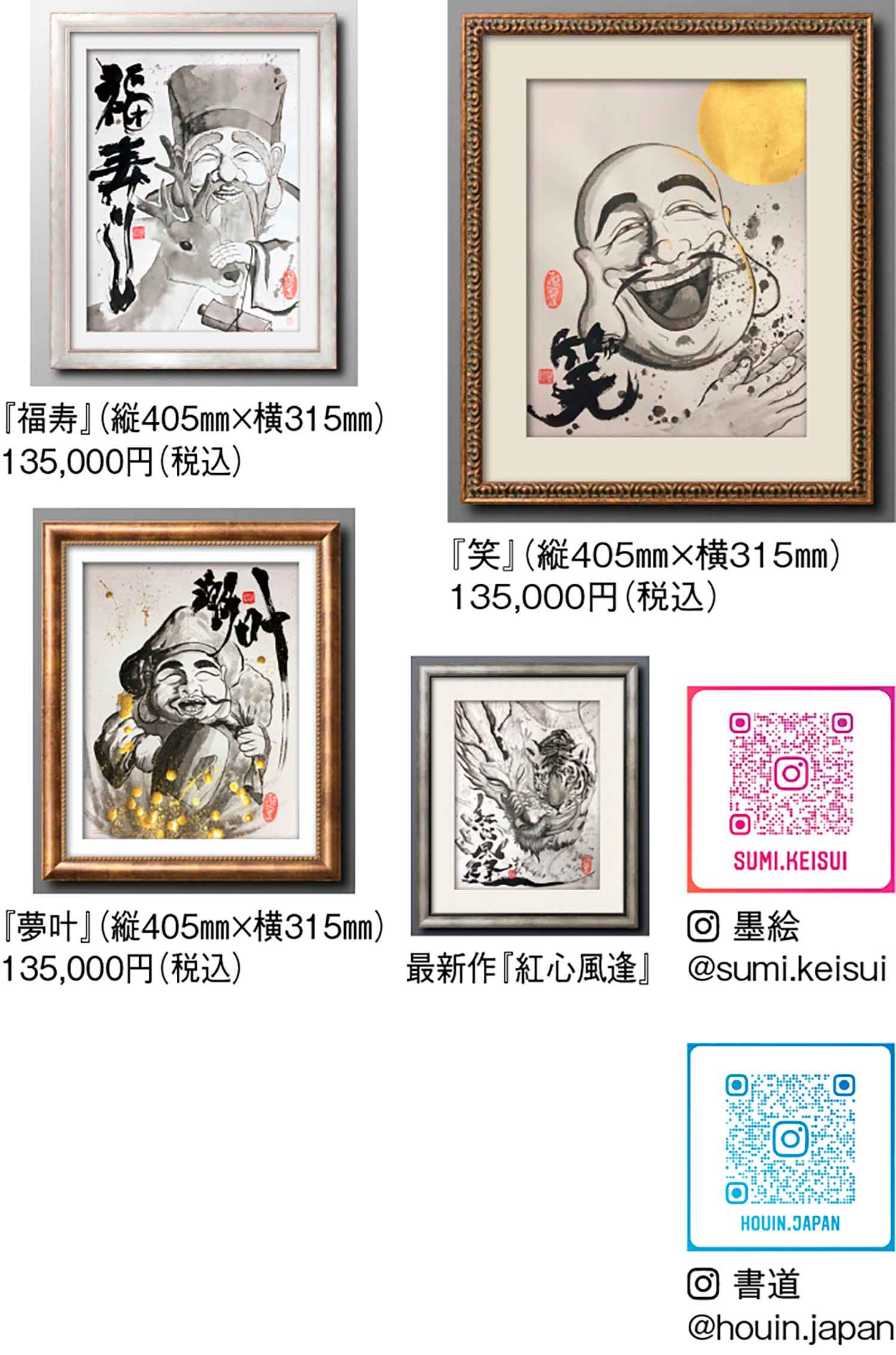 しっかりとした筆致の書とユーモラスな墨絵、そして優しく、しかし力強く背中を押してくれるその言葉。『豊殷』さんは、発表する作品とSNSを通じて「言葉で救える命はある」と、悩める人たちの力になるべく活動を続けている。墨絵師、『啓翠』さんが墨絵を描き、『豊殷』さんが黒地に金の筆文字で、流れるように書かれた作品。書道と墨絵の力で、悩み・苦悩で暗かった目の前がパッと明るくなるような感動を与えてくれる。少しでも勇気づけられたらと思い、制作している。