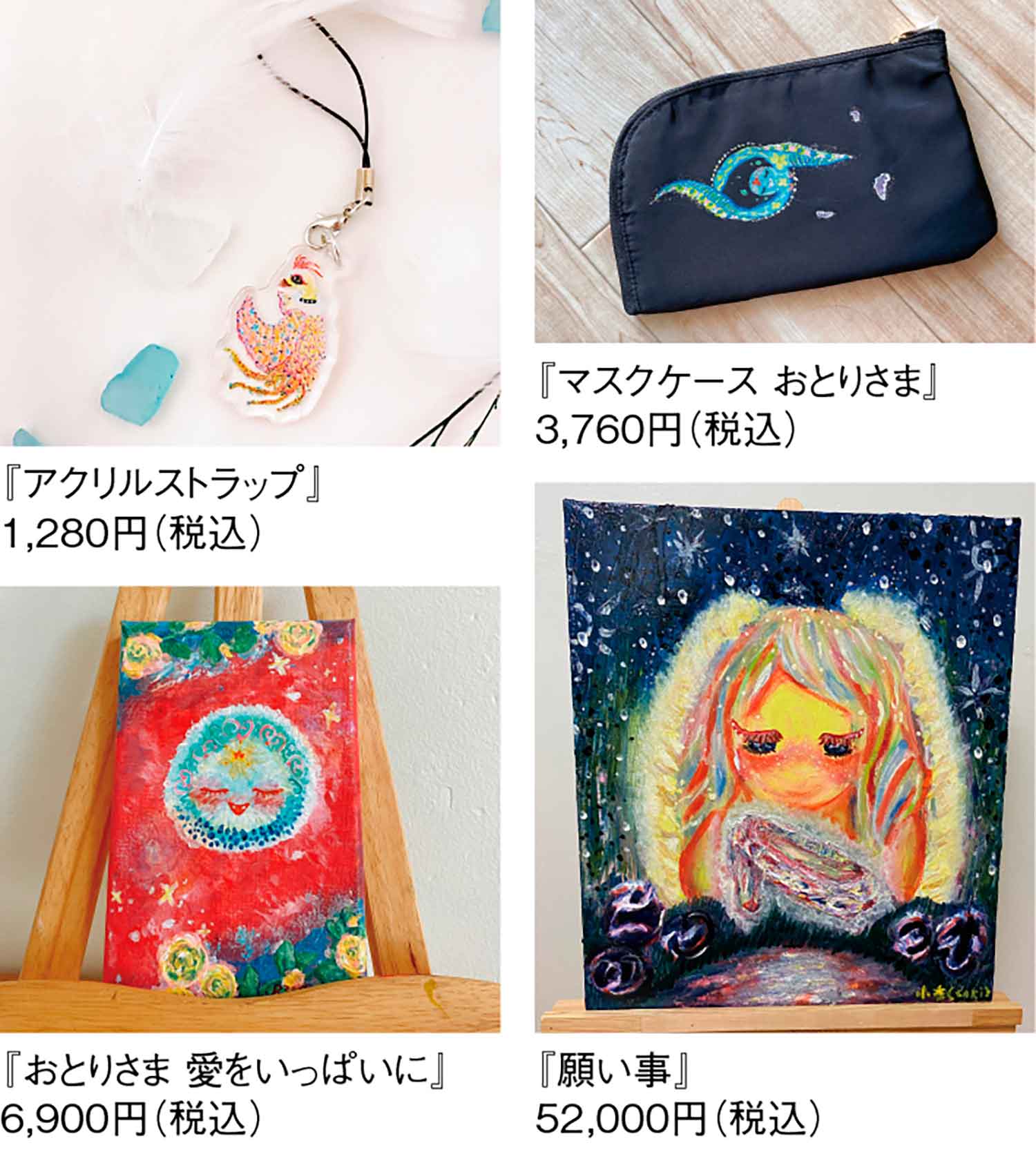 子どもの頃から見えていた世界に広がる細かな粒子。その粒子は、魂が生きていく際に削られて光っているものであり、自然から放出されるものかはるか過去のものも混ざっていのではと考え始めたアーティスト『小季』。チカチカと光るその粒子を精霊『おとりさま』としてキャンパスだけでなく、布やポシェットなど様々な素材に描いている。魂の声と世界の変化を伝えていくような作品をぜひ手元においてほしい。