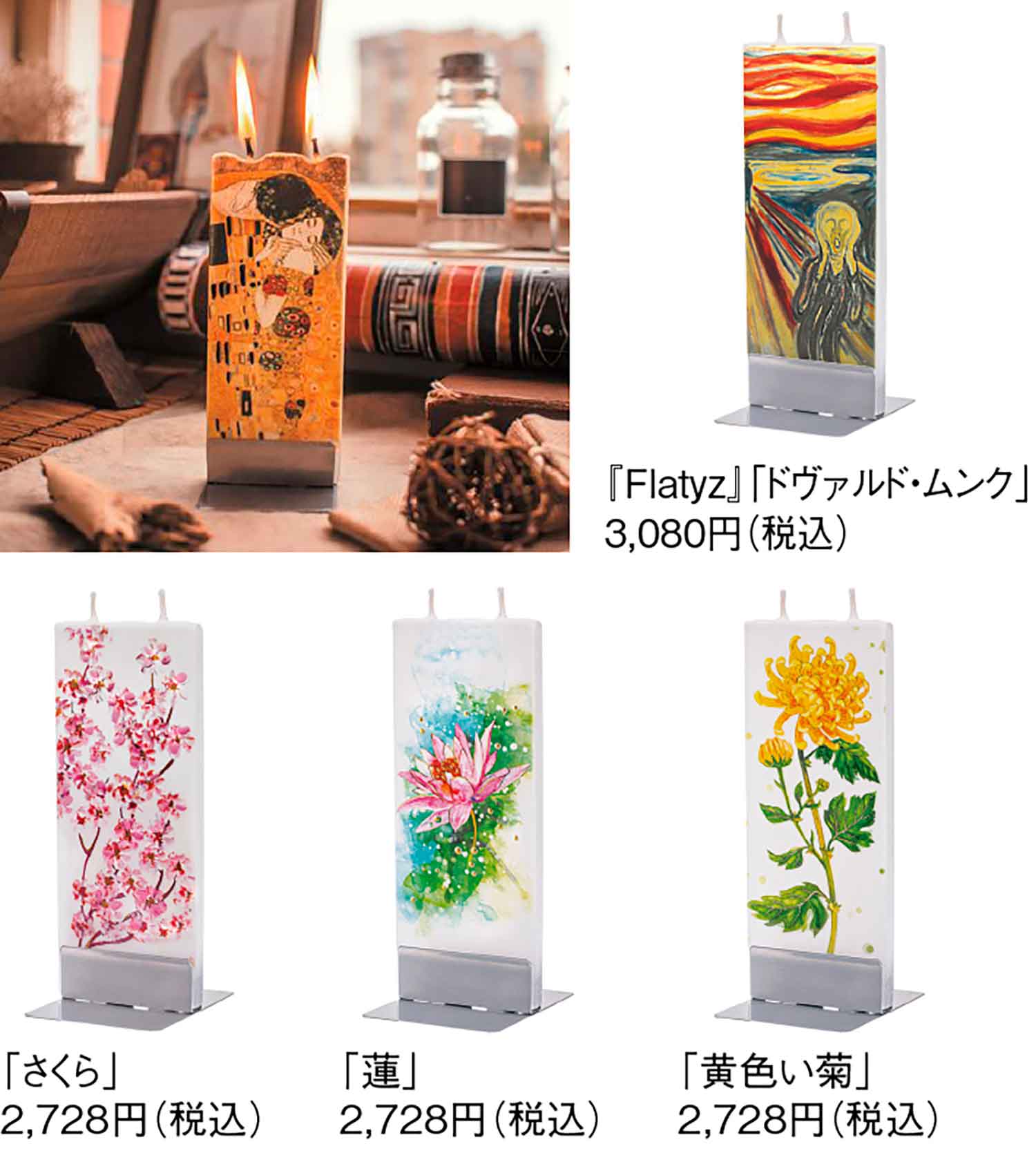 リトアニアの二人のキャンドル職人が考案した板チョコサイズのろうそく『Flatyz(フラッツィ)』。特許を取得した製法で平らな表面とスモークレス、ドリップレスを実現。各アーティストがそれぞれの技法を用い、凹凸感のある立体的で、美しいデザインを施したろうそくを作りあげた。ろうが垂れてこないので最後までデザインを楽しむこともできる。火をつけずにそのまま飾るのもオススメ。封筒で送ることもできるので、ギフトにもぴったりだ。