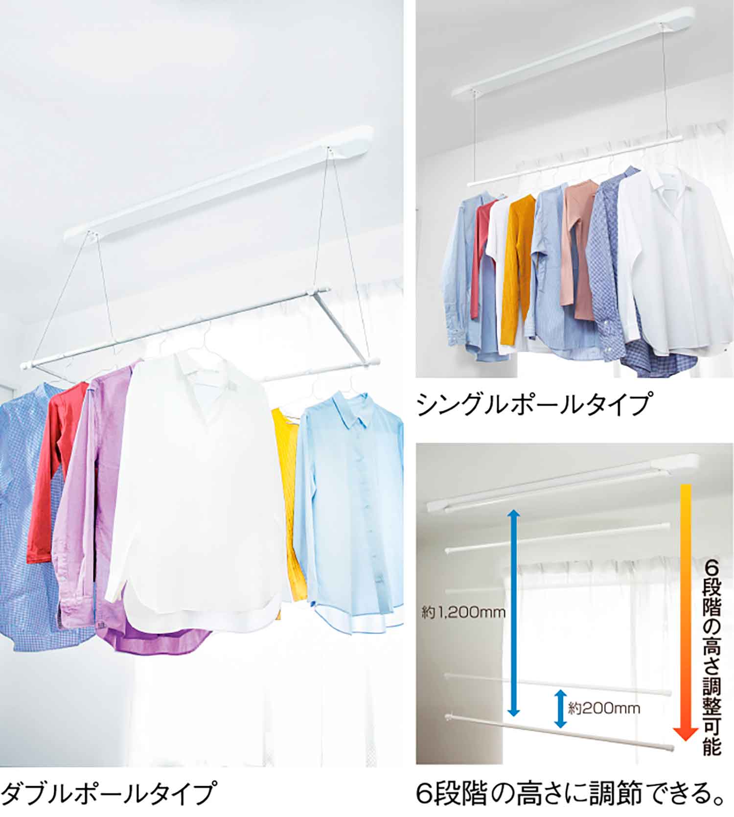 専用の洗剤まで発売されているように、「部屋干し」をするケースが増えている。そんな時に便利なのが『モリテックスチール株式会社』の天井から吊るすタイプの室内物干し『ルームハンガー』。必要な時だけ天井に取り付けた収納部から引き出し、不要な時はスッキリ収納。インテリアの邪魔にもなりにくい。引き下げ紐で背の低い女性でもワンタッチで六段階の高さに調整可能。ポールが二本のダブルタイプも有り。