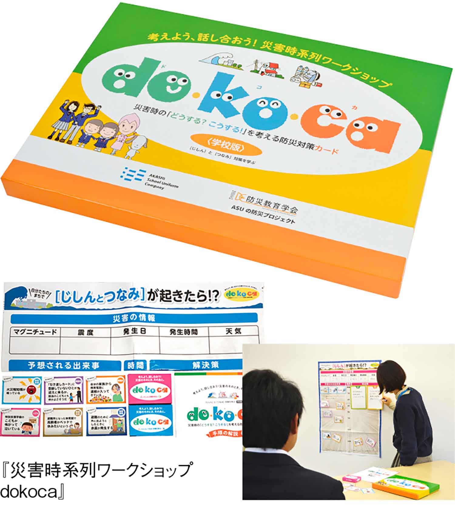 「富士ヨット学生服」でお馴染みの『株式会社明石スクールユニフォームカンパニー』では、学校で子どもたちが防災について考える事のできる教材『災害時系列ワークショップ dokoca(ドコカ)』を発表した。地震や津波が起きた際の「あなたならどうする?」「わたしならこうする!」をカードや解決策シートを使ってグループで議論しながら災害を疑似体験。いざという時のことを自分事として考えられる力を養う。