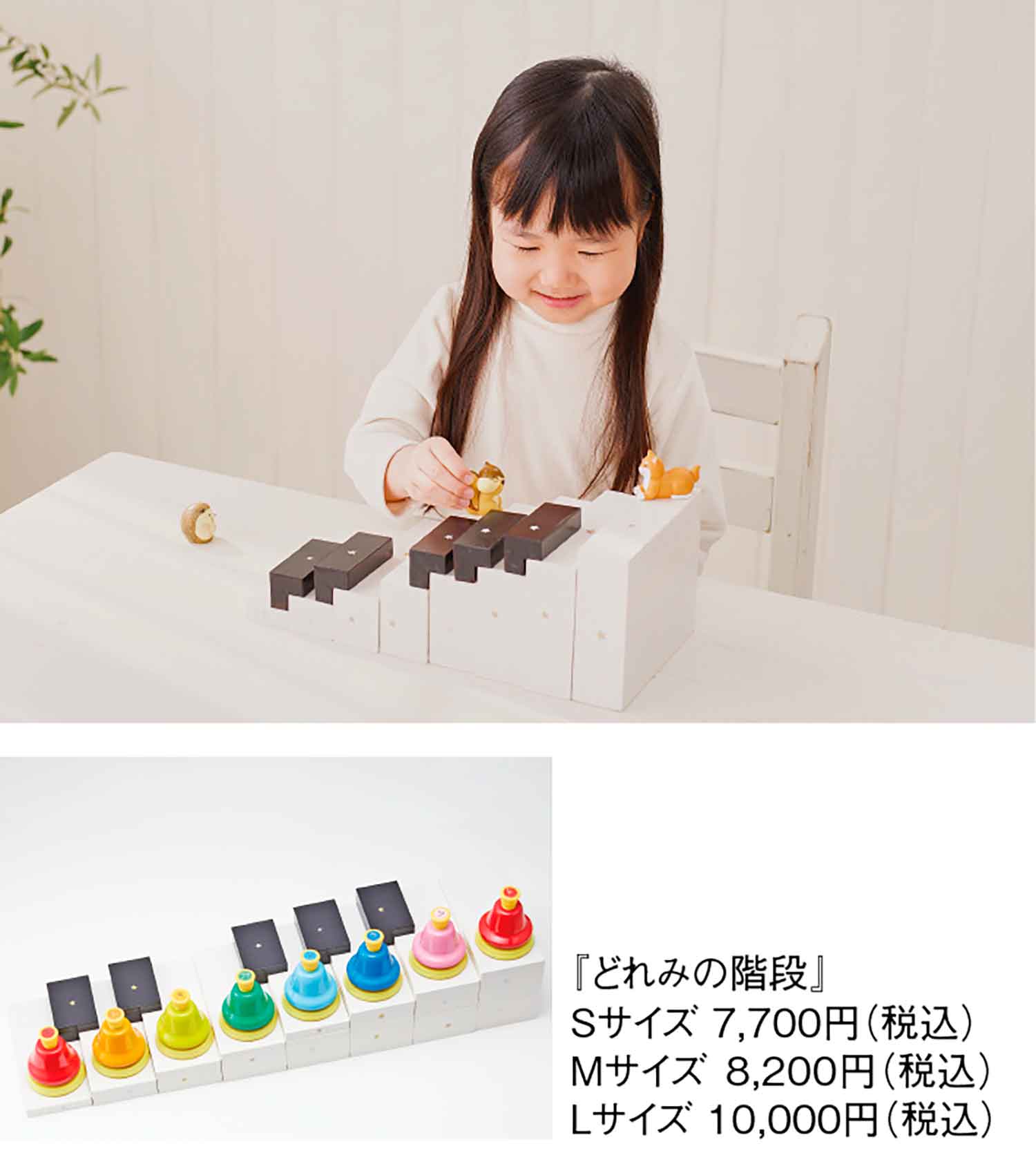幼児期のピアノレッスンで苦労するのが導入教育の方法。鍵盤を左から右へ移動すると音が高くなる音階の認識がなかなか難しいのだという。そこで滋賀県のピアノ講師である宮戸有子さんが考案したのが『どれみの階段』。ピアノの鍵盤を模した積み木を階段状に並べることで、音の高低が視覚的高低とリンクして小さな子どもでも理解が進みやすい。積み木の上に鉄琴やハンドベルを置き、鳴らして遊ぶとより効果も大きい。