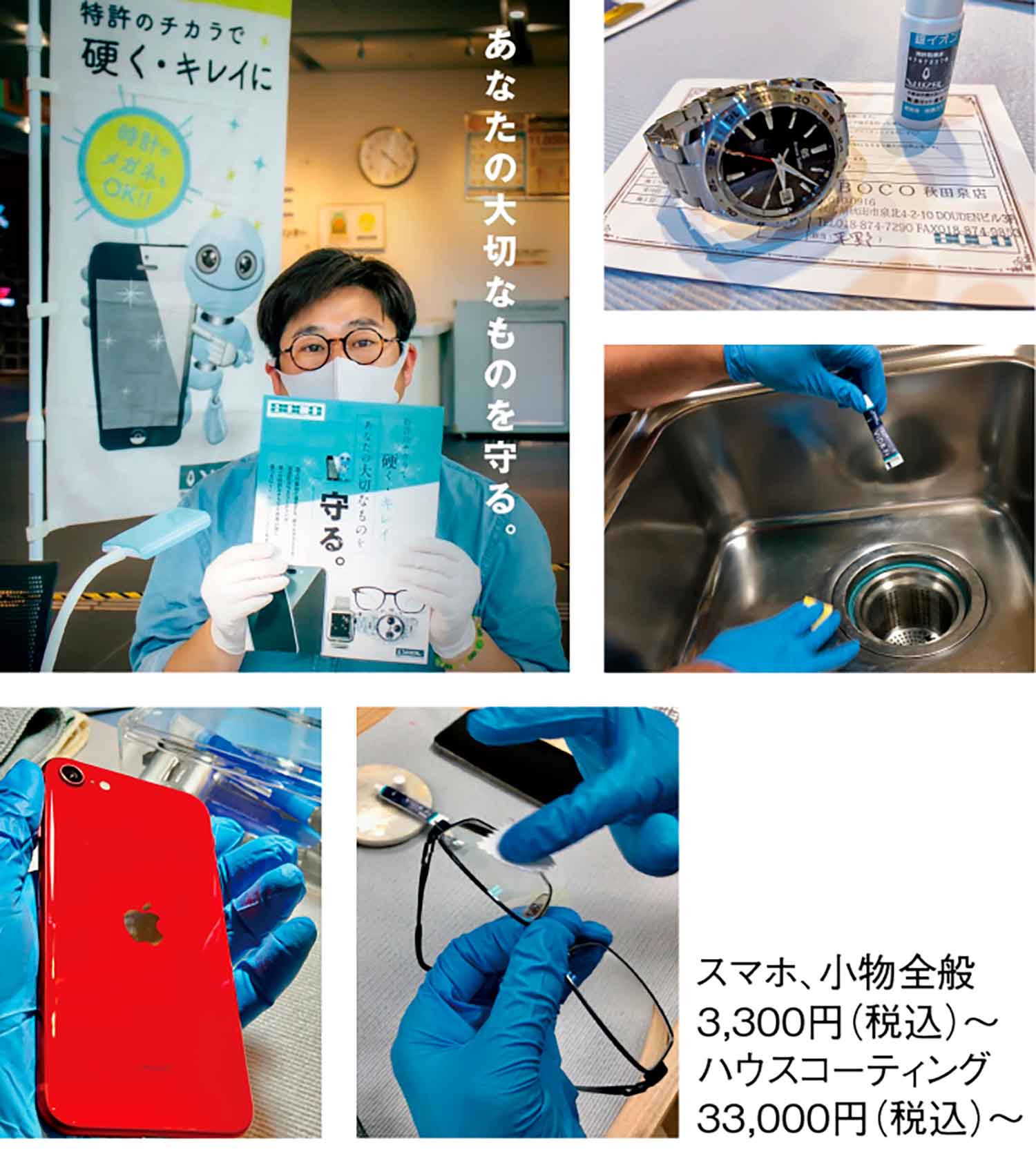 ガラスコーティングPROショップ『BOCO東北』は、浸透型のコーティング施工。特許取得済の溶剤がナノサイズで奥深く浸透し、一体化して表面をガラス化するので、強度が上がり、キズや汚れが付きにくく割れづらくする。スマホをはじめ革製品や腕時計など多種多様な小物をコーティングすることが可能。ハウスコーティングでは、水あか、防カビや防汚れにより掃除が楽になる。さらにリノベーションすることにより、キズを落とし、〝新品そっくりん⤴〟同様に仕上がる。全国加盟店募集中!
