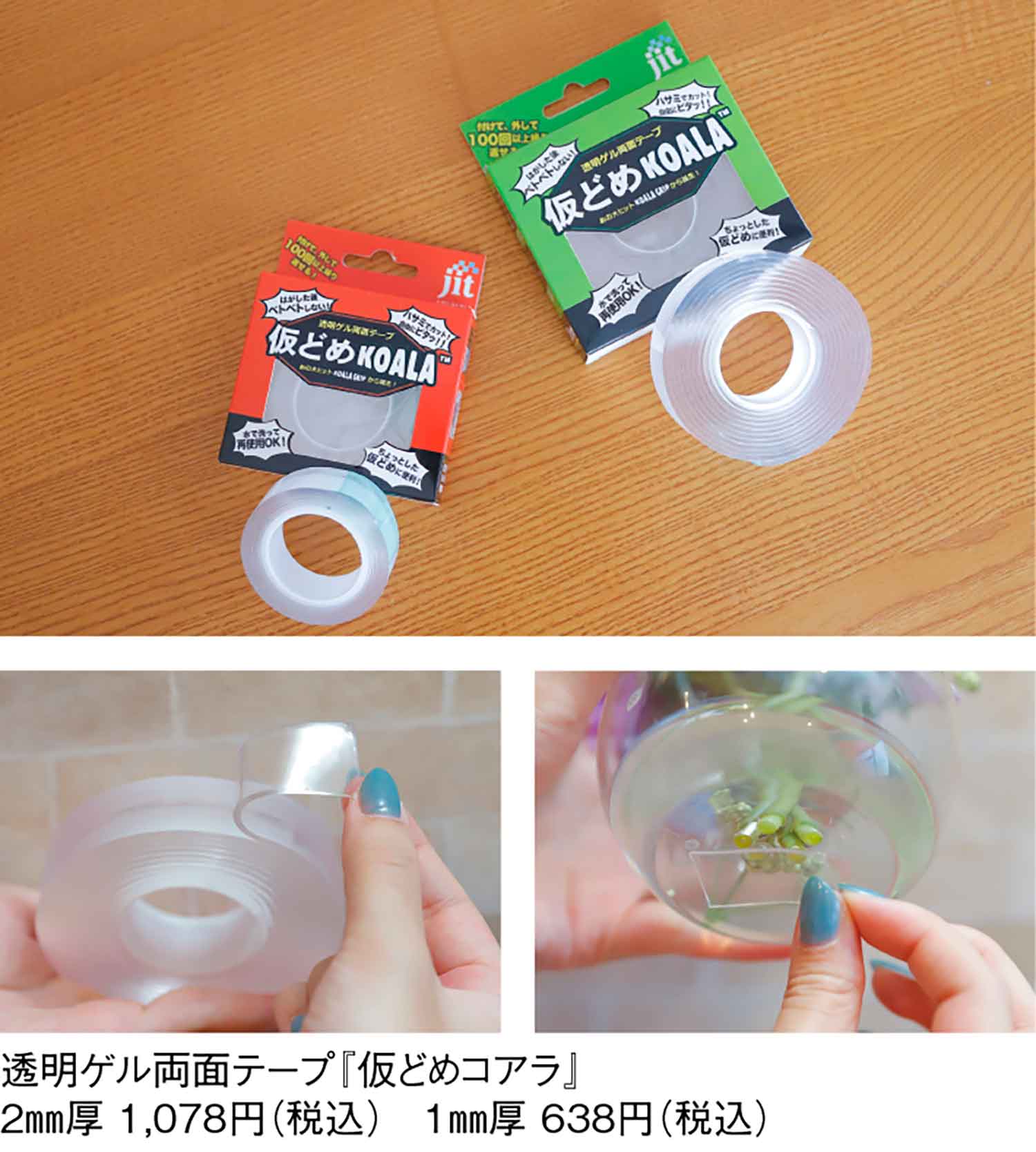 釘や画鋲が使えない場所にメモなどのメッセージを留め付けておきたい、ポスターなど貼り付ける位置が決まらない時にテープの跡を残さず仮どめしたい…そんな時にぴったりなのが『ジット株式会社』の『仮どめコアラ』。好みの長さに切って繰り返し使える透明ゲル両面テープだ。5g程度のボールペンなら100回以上繰り返し仮どめできる接着力。ほこりでくっつかなくなっても、水洗いで接着力が回復する。