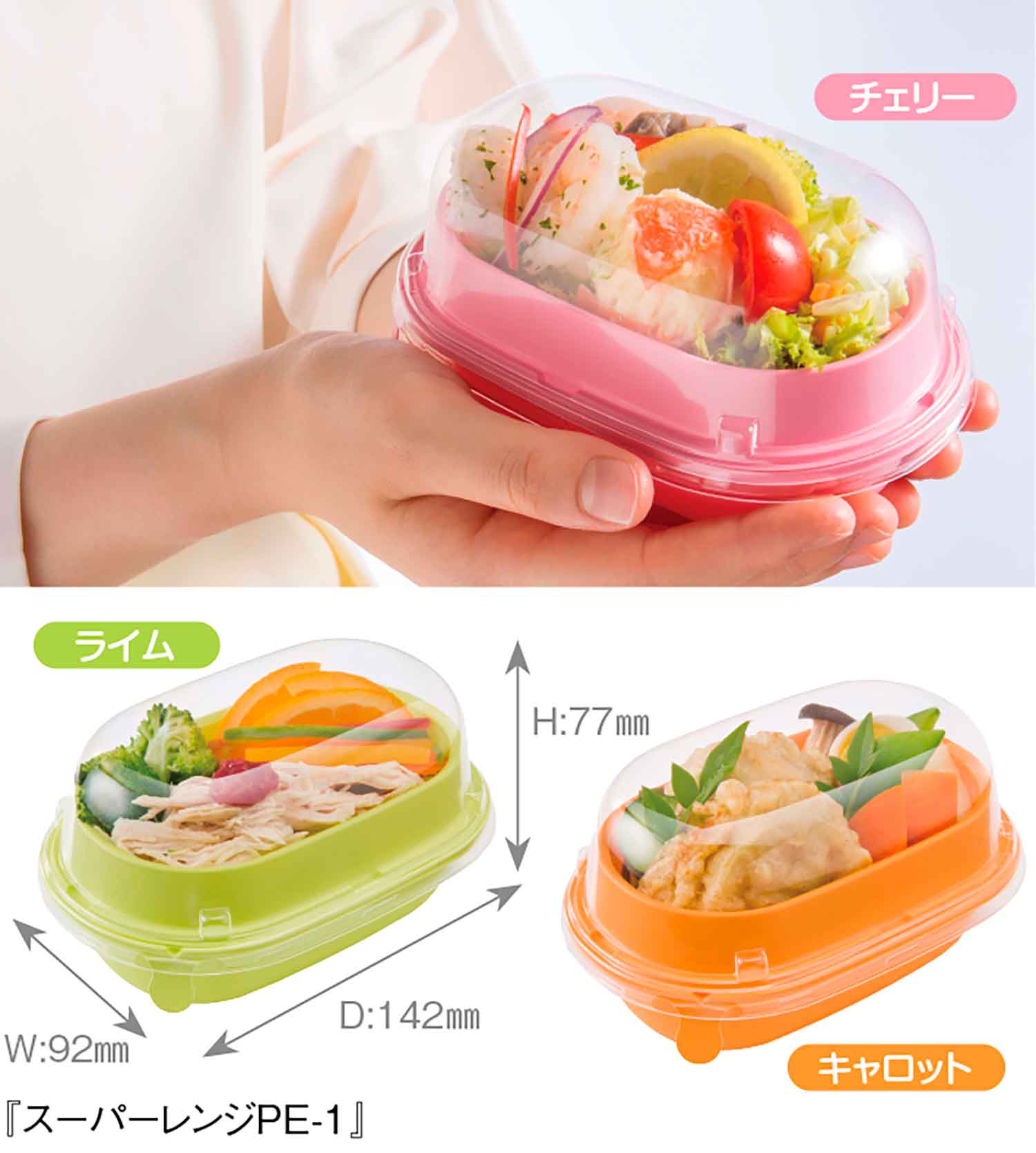 日本の食品小売業を支えるメーカーの一つで、主にベーカリー、惣菜向けのプラスチック容器を開発・製造する『スミ株式会社』。『スーパーレンジPE|1』は、コンパクトな二段構造のランチボックス。本体と中皿はそれぞれパステルカラーのチェリー、キャロット、ライムの3色を用意。9通りからなるカラーの組み合せは、料理や気分に合わせて変えても楽しい。蓋を取ってレンジで温め直しも可能。中皿を外せば、背の高い料理もスッキリ収まる。