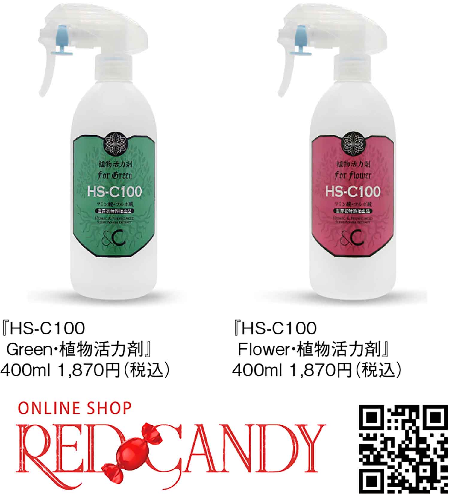 『HS-C100 Green・植物活力剤』と『HS-C100 Flower・植物活力剤』は、世界初の特許抽出法による樹木熟成発酵同時抽出フミン酸フルボ酸を配合した、そのまま使えるスプレータイプの植物活⼒剤。植物が大きく、生き生きとキレイに育つ。100%天然由来の完全国産品のスプレー。生育改善や成長促進、病原菌抵抗力UP、光合成促進など様々な効果が期待できる。使用頻度は、週一回程、植物全体(葉や根本)にスプレーするだけでOK。