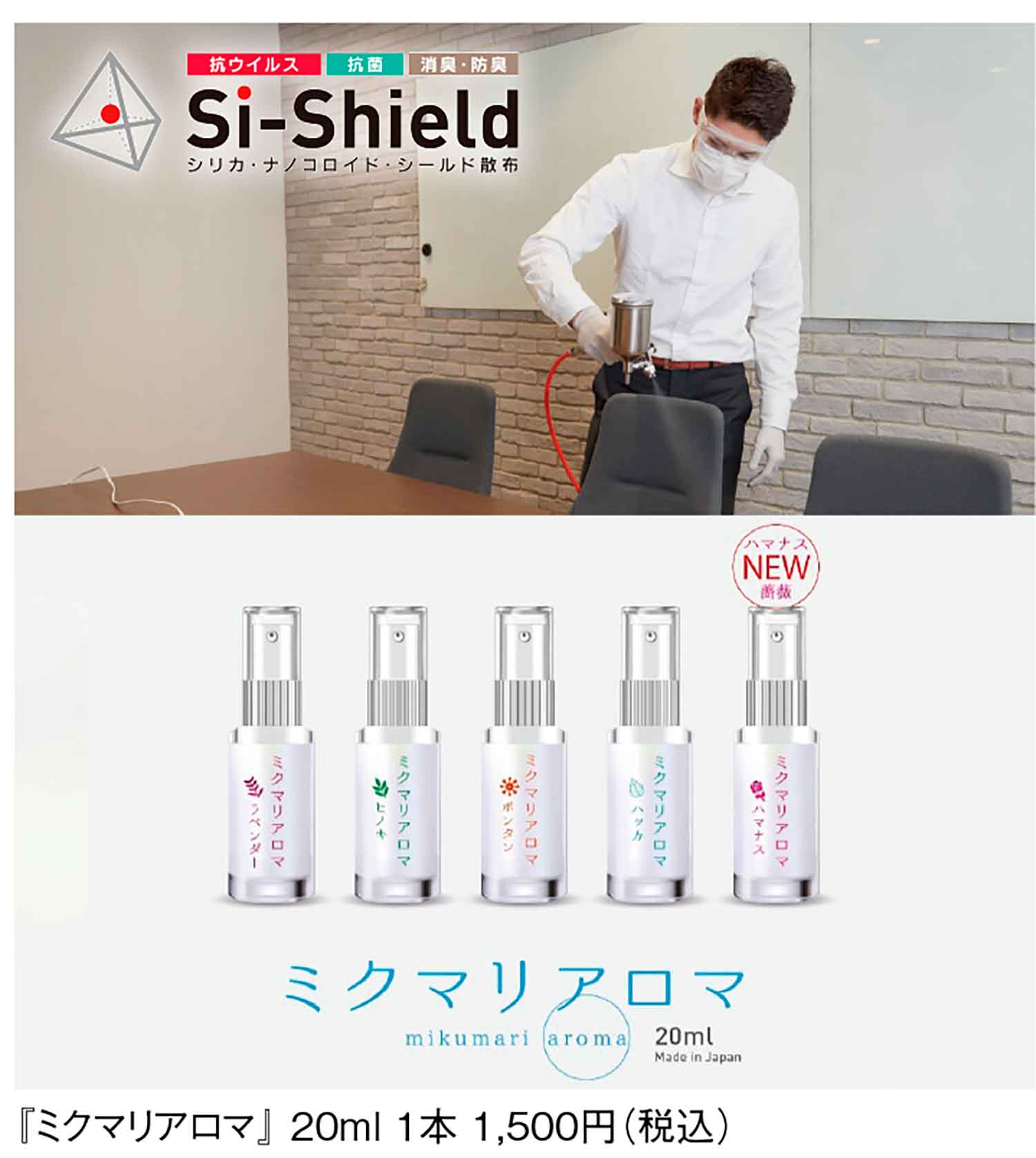 『Si-Shield』は、2000種類以上の菌やウイルスに対応。防カビ、防臭、消臭効果も備え持つ優れた抗菌・抗ウイルスコーティング剤。屋内において天井や壁、家具や衣類など細かなところまでナノレベルで入り込み、しっかり付着し、驚きの持久力を発揮する。その効果と安全性は、第三者機関「SIAA」などにおいて認められている。新型コロナウイルスへの効果も実証済みで自社製品を抗菌、抗ウイルス加工をすることも可能だ。またマスク用コーティング剤も販売しておりハッカやヒノキなど5種類の香りがある。香りの効果で気分爽快。ワンプッシュで抗ウイルス、抗菌加工ができる。