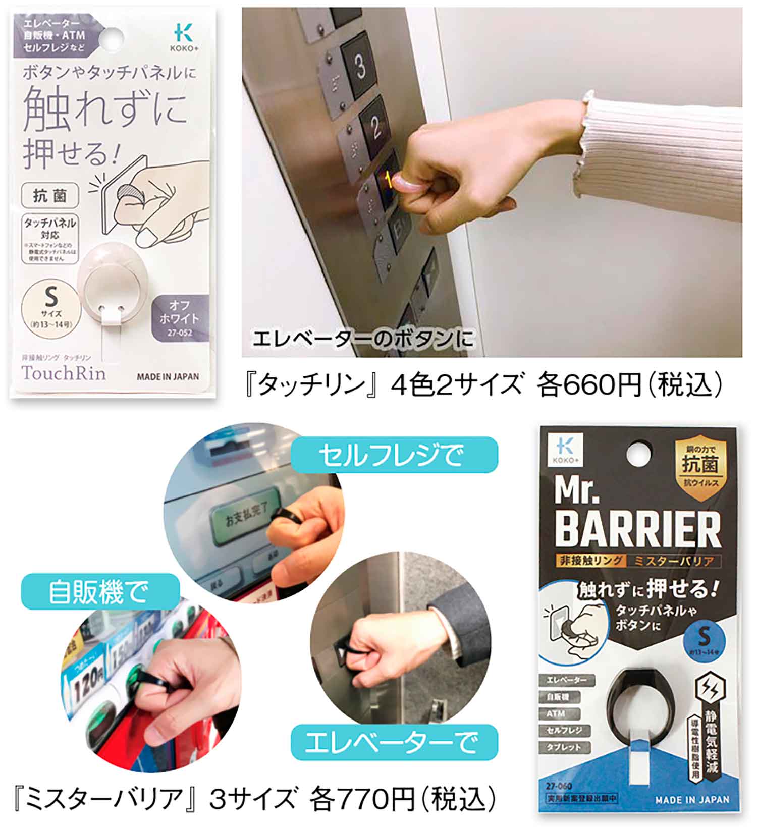 コロナ禍が訪れてから、誰が触れたともわからないものに触れるのに抵抗があるという人は多い。ましてやボタンという、触れられる機会の多い部分はなおさら抵抗感が強いもの。そんな人にオススメなのが『株式会社KAWAGUCHI』の『タッチリン』と『ミスターバリア』だ。指輪の形状をしており、指にはめることで直接触れることなくボタンやタッチパネルを押すことが可能。抗菌素材でできているので安心して使える。