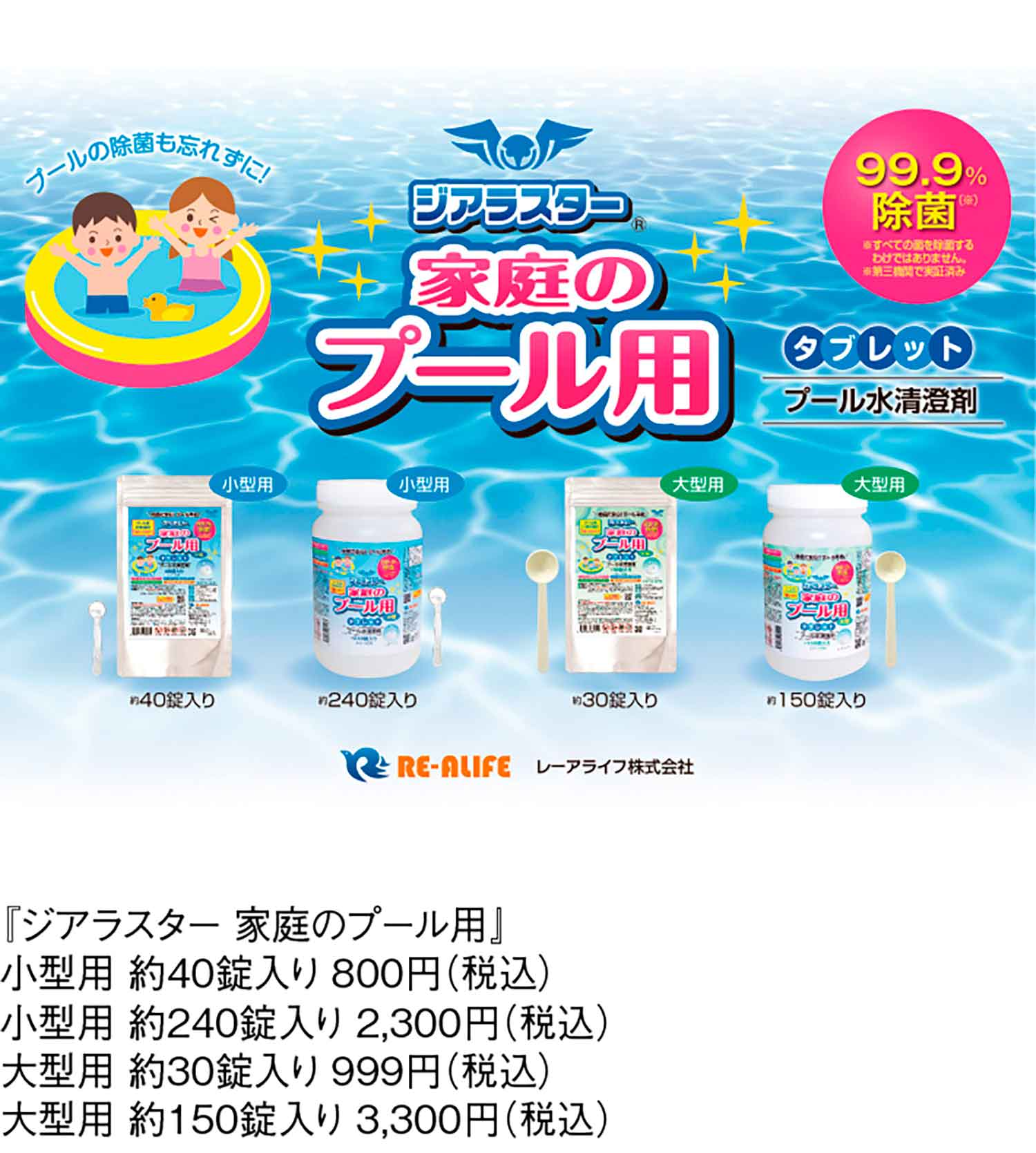 汚れを捨て、水を足すだけ。安全な理由は「塩素」があるから。ジアラスターの成分は「ジクロロイソシアヌル酸ナトリウム」と呼ばれる塩素。小型用なら200Lに一錠、大型用なら1000Lに一錠、簡単に家庭 用プールの水を除菌、嫌なぬめり、ニオイを防止できる。その他、多用途に応じた粉末製品もあり。
