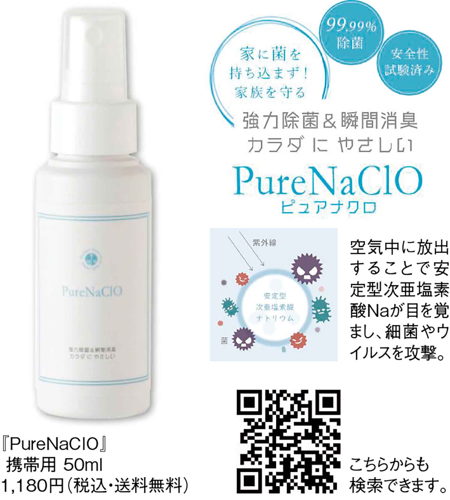 せっかく手をキレイにするために消毒をこまめにしているうちに手が荒れてしまうなどの経験をしてる人もいるはず。そんな悩みを解決してくれる『Pure NaCLO(ピュアナクロ)』 は、従来の除菌・消臭製品で可能にできなかった口に入っても影響のない安心・安全な製品。瞬間除菌率は、脅威の99・9%以上。ありとあらゆる細菌・ウイルスに対応し、環境省指定の8大悪臭、気になる嫌なニオイ菌も瞬間消臭が可能だ。