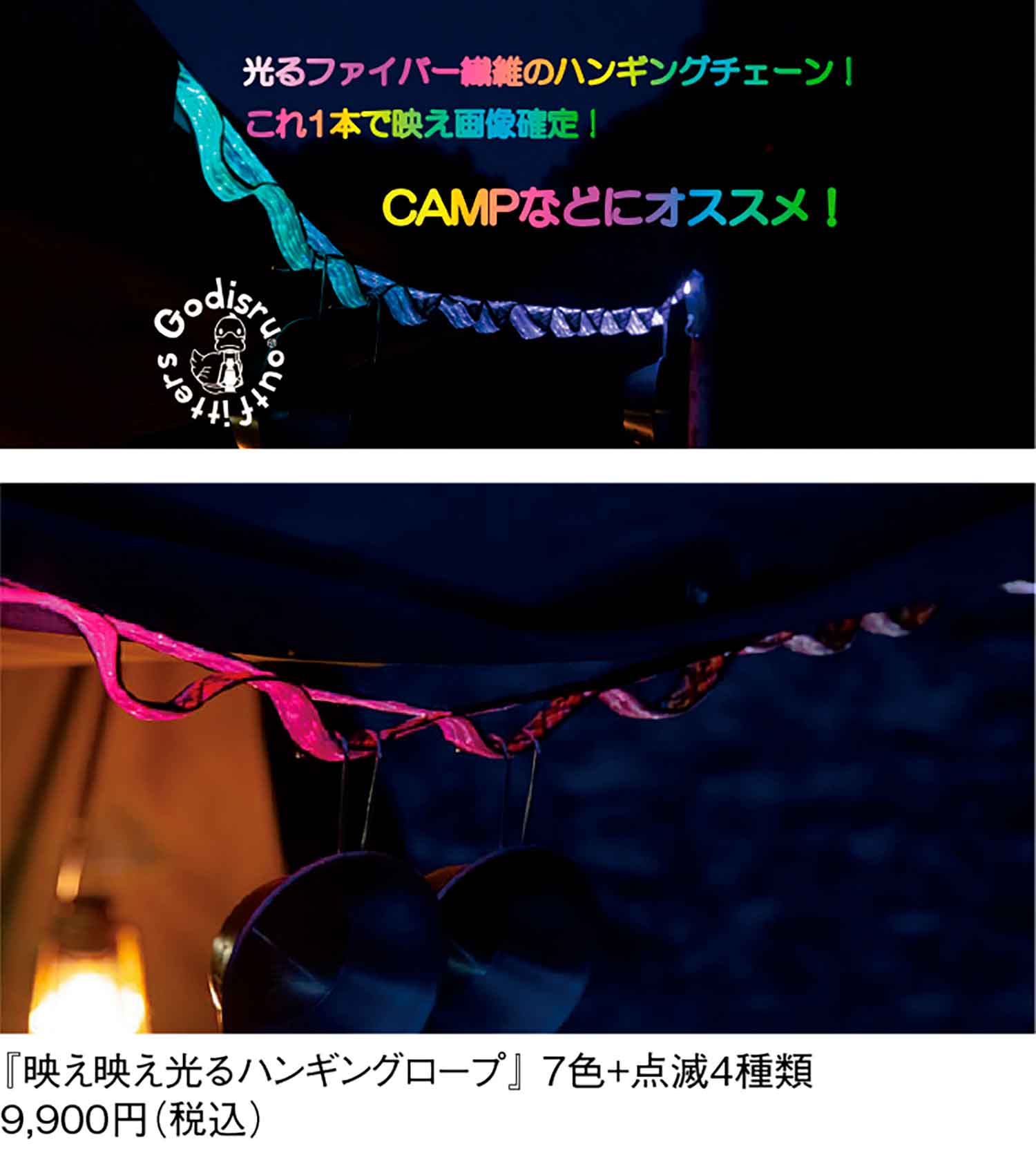 近年、すっかりメジャーなアウトドアグッズとして認知されているハンギングロープ。様々な形態、素材の商品が出ているが、中でも注目されているのが『Godisru』の『光るハンギングロープ』だ。極細の光ファイバー繊維を編み込んだ生地でできており、ロープ端の充電池とスイッチで発光七色と点滅四種類を切り替えられ、夜のテントの出入りも安全に。シェラカップなど軽いものをかけておける。