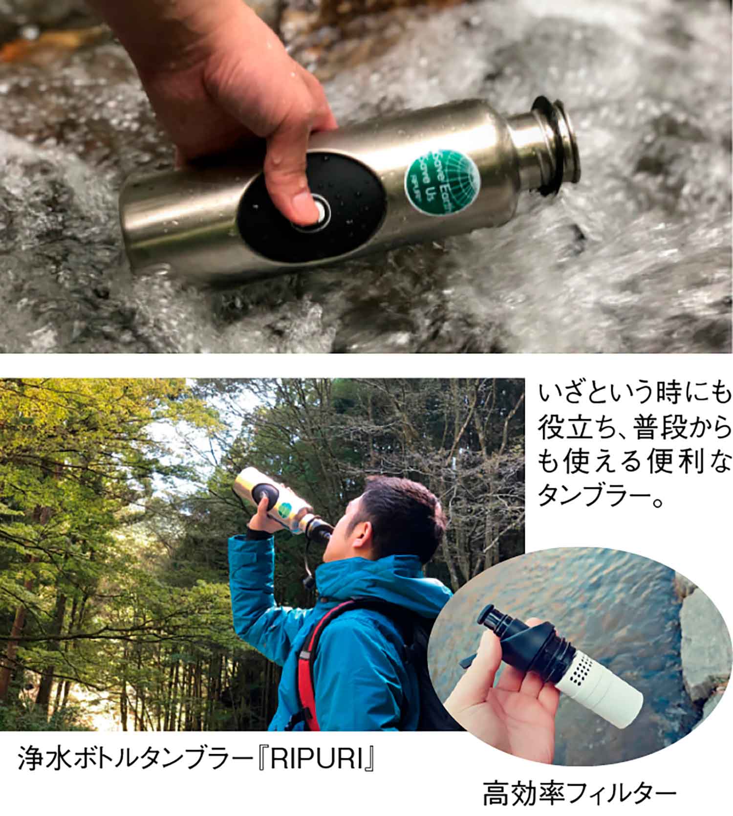電源や薬品類は不要で、最大300リットル、ウイルス・微生物レベルまで99・9%除去できる浄水能力を持つ高機能フィルターを備えたステンレスボトル『RIPURI(リプリ)』。アメリカやペルーの軍隊でも採用されている世界水準の浄水機能で、事故や災害などの非常時でもあらゆる水を飲用することが可能に。フィルターを外せば普通のステンレスボトルとしても使えるので、常備して万が一にも備えておける。