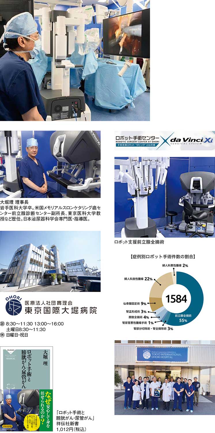 米国発の胸腔、腹腔の内視鏡下手術用ロボット「ダビンチ」を使った手術で国内屈指の施行実績を持つのが『東京国際大堀病院』の大堀理(まこと)理事長だ。ロボット手術センターには、Xi、Xの最新鋭機種2台を導入、泌尿器科系と婦人科系の疾患の手術治療に使っているが、中でも実績が際立つのが前立腺がんに対する前立腺全摘術による治療。開院した2019年から2023年12月までのロボット支援手術1584例の約6割を占める879例にのぼる。