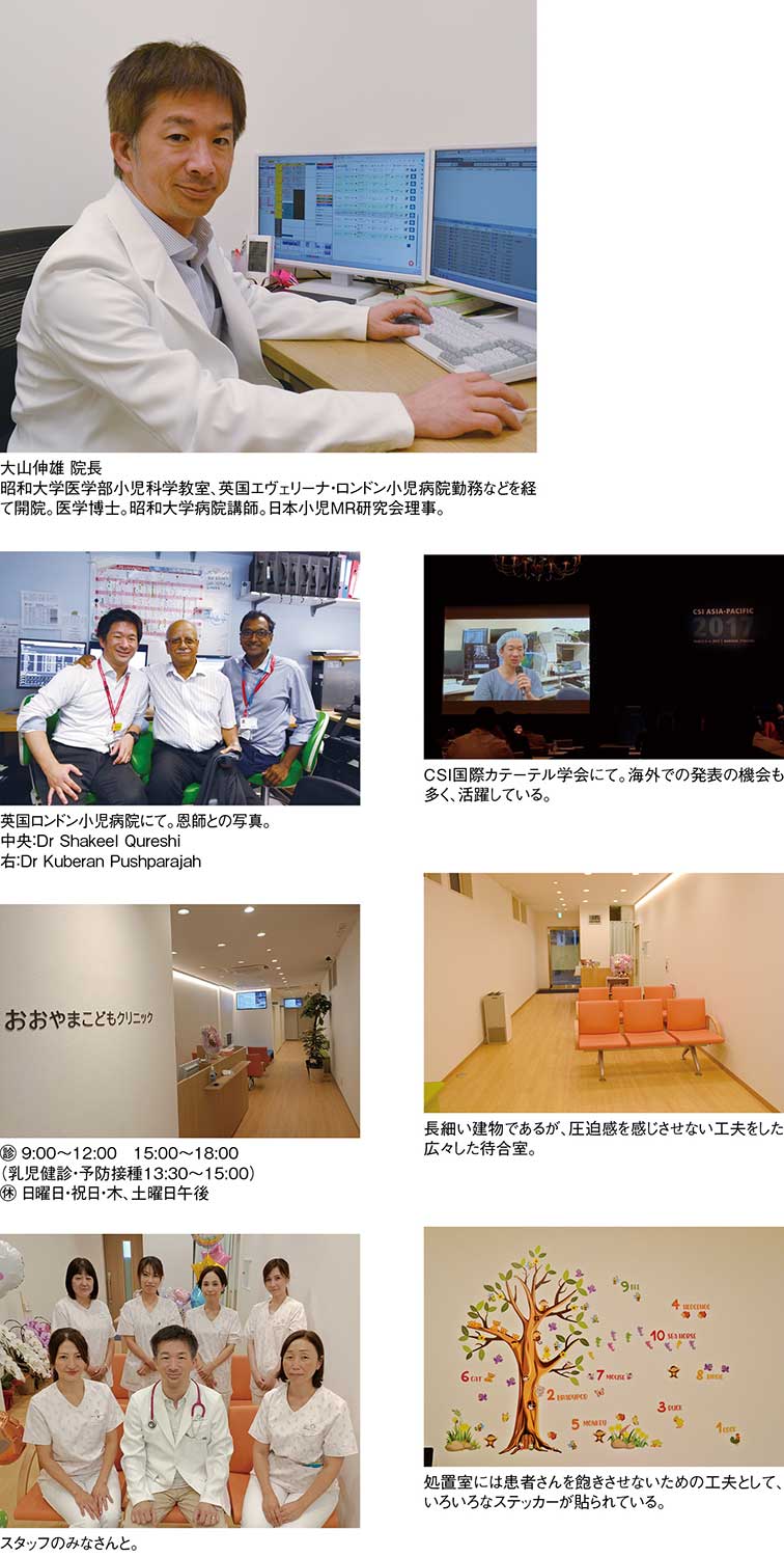 『おおやまこどもクリニック』の大山伸雄院長は、乳幼児の血管に炎症が起こる川崎病の冠動脈病変の検査方法に関する研究で医学博士の学位を取得した。昭和大学病院で兼任講師を務める小児心臓MRI研究の第一人者である。海外での研究発表の機会も多く、世界を渡り歩いてきた。2016年からの2年間、英国ロンドンの小児病院で臨床研究医として働き、帰国後は日本小児心臓MR研究会理事として尽力した。昭和大学病院で小児循環器医として専門分野での仕事と後輩たちの育成に努めてきた。2023年、更なる活躍の場を求め嘗てからの夢であったクリニックを開院した。