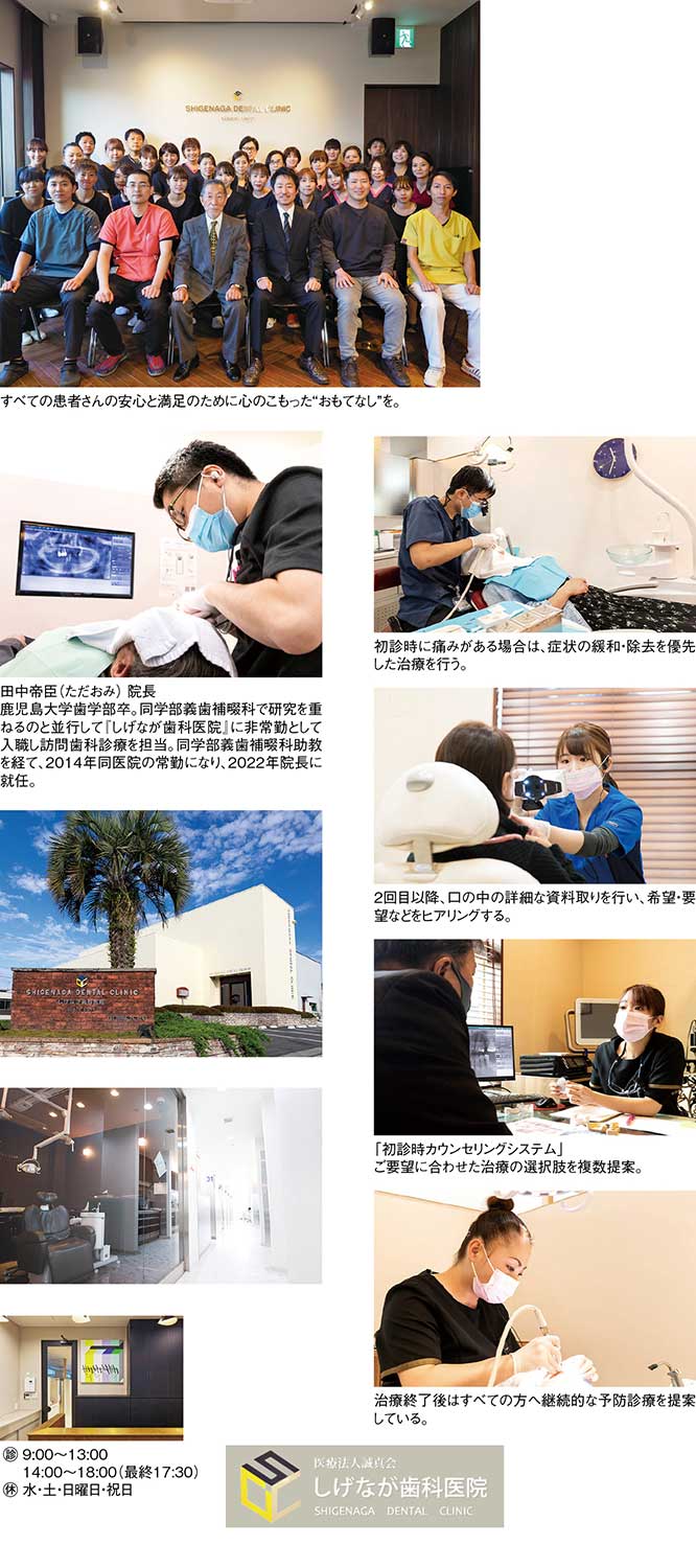 鹿児島県薩摩川内市の『しげなが歯科医院』は、10人の歯科医師をはじめ歯科技工士、歯科衛生士、歯科助手など合わせて約60人の陣容を擁する歯科医療の総合病院的な存在だ。創立者の重永誠之理事長から2022年に医院の運営を託された田中帝臣院長は、高齢化が加速する中で需要が高まる訪問診療に力を入れてきた重永理事長の運営方針に共鳴して同医院に入職した初心を大事に、訪問歯科診療のさらなる拡充を目標に掲げ、予防歯科の強化と合わせ、地域住民の健康な体づくりに貢献していく考えだ。