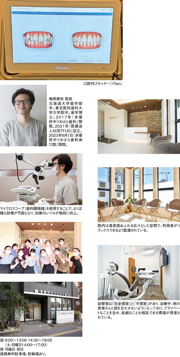 2023年6月1日には、さらなる地域貢献を目指し、府中市宮西町ザ・パークハウス府中1階にて『多摩府中うめはら歯科南口院』が新規開院。
