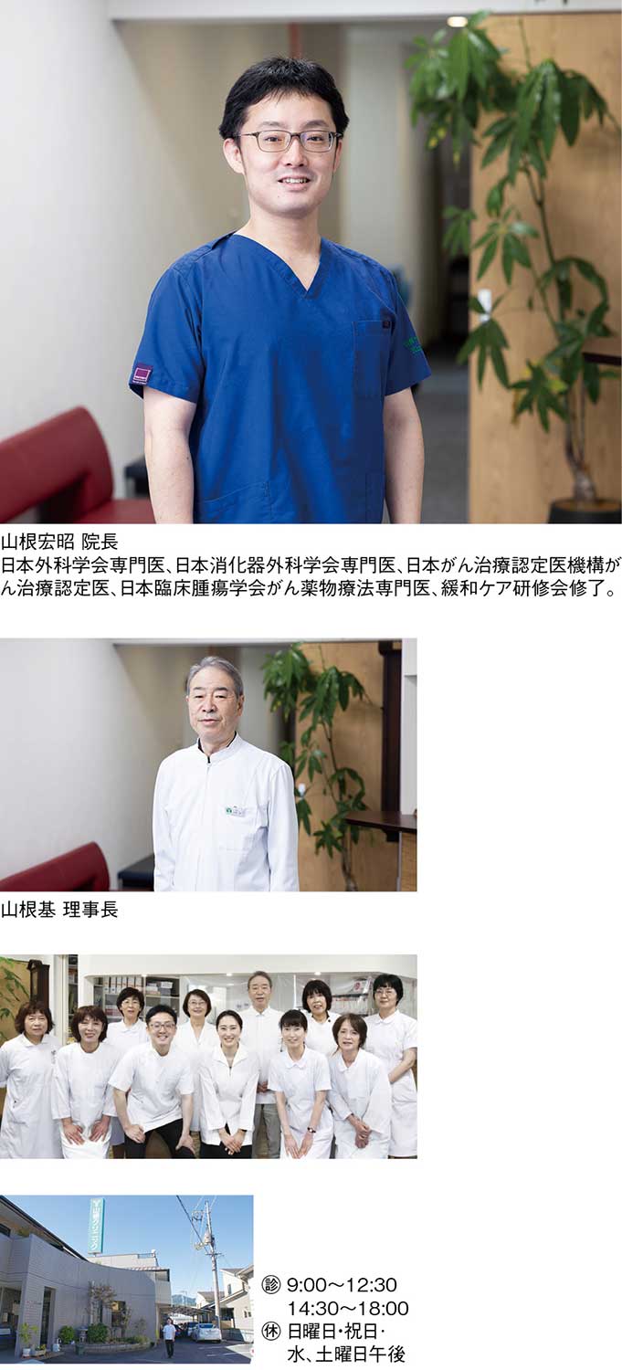 『医療法人緑康会山根クリニック』は、山根基理事長、息子の宏昭院長の体制で内科、外科、消化器内科、肛門科、乳腺科、訪問診療など幅広く手がけ、「究極の家庭医」を標榜する医院。がん薬物療法専門医である宏昭院長が力を入れているのが、がんの早期発見と緩和治療、終末期のケアだ。