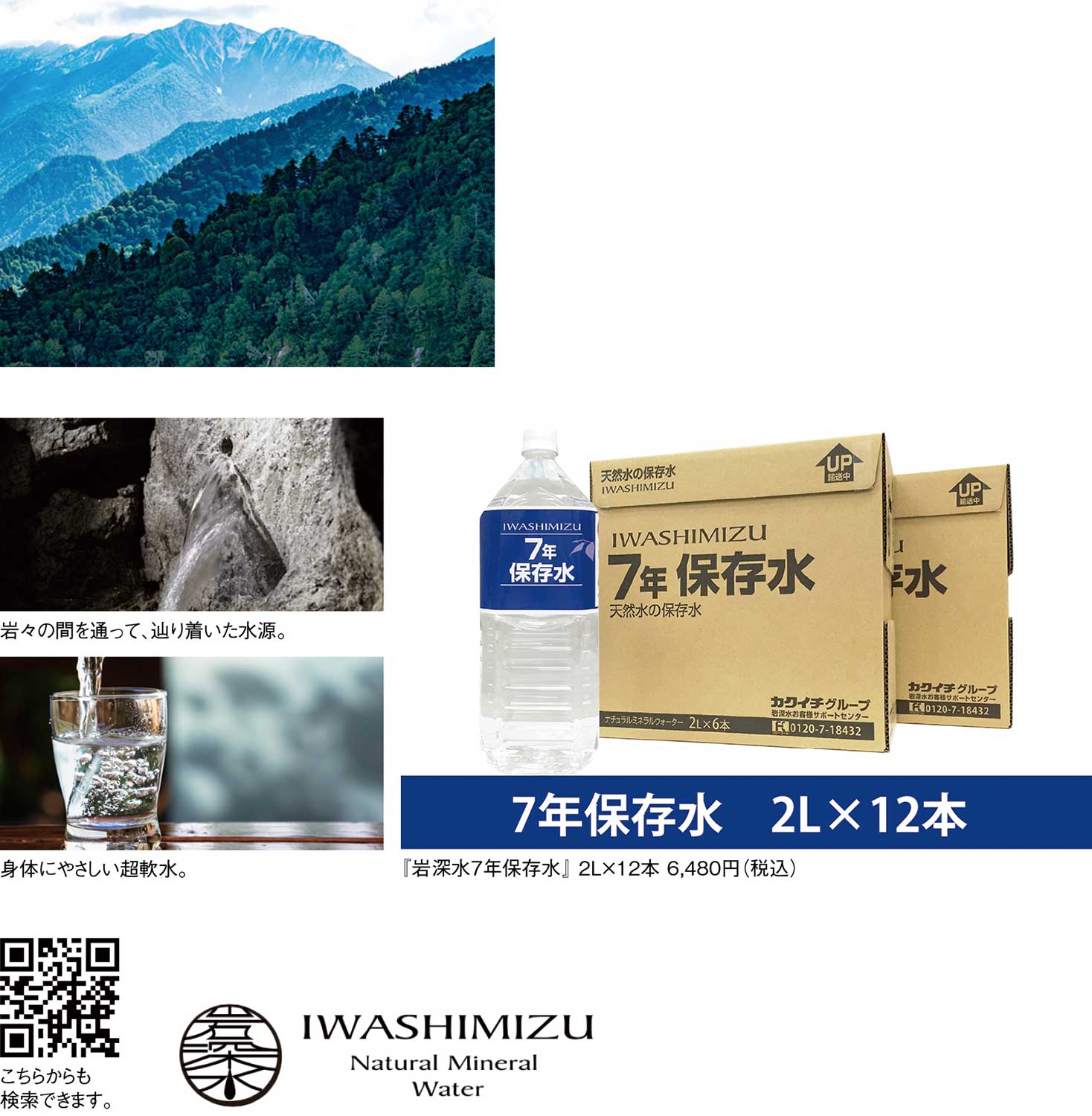 『株式会社岩深水』の『7年保存水』は、滋賀県・岩間山の鉱山坑道で湧き出た地下深層水を非常時のためにおいしさごと閉じ込めた一本。花崗岩を採掘する際、発破用に穿った穴から偶然ほとばしった湧水で、数十年から数百年をかけ岩々の間を旅してきた水が地表に現れたという由来を持つ。花崗岩層に磨かれた水は不純物が少なく、硬度12の身体にやさしい超軟水。カルシウムやマグネシウムが控えめで、まろやかな口当たりが際立つ。赤ちゃんのミルク作りや薬の服用、繊細な出汁を取る料理にも相性がいい。