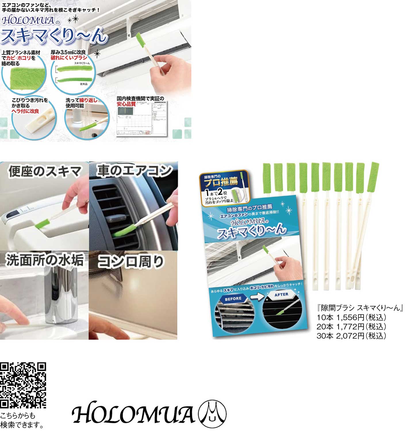 お掃除専門のプロも推薦する『HOLOMUA』の『隙間ブラシ スキマくり~ん』は、エアコン掃除用の隙間ブラシとして登場。ファンの隙間掃除にも使用できるのでとても助かるブラシだ。エアコン以外にもキッチンや洗面所、窓のサッシ、家電のまわりなど様々な隙間の手が届きにくい場所の汚れをしっかり落とす便利なお掃除ブラシ。細くしなやかなブラシ形状で、狭い隙間にもスッと入り込み、ホコリや黒ずみ、髪の毛などをかき出す。力を入れすぎなくても汚れを絡め取れるため、毎日のお掃除がぐっとラクに。使いやすいサイズ感で、気になった時にサッと使えるのも魅力だ。従来品よりも極厚ブラシで破れにくく、洗って繰り返し使用可能。こびりつき汚れをかき取るヘラも取り付けた。家庭の使用頻度や用途に合わせて、10本セット・20本セット・30本セットを用意しており、キッチン用・水回り用・掃除道具入れ用など、場所ごとに使い分けも可能。消耗品としてストックしておけば、いつでも清潔を保てる。