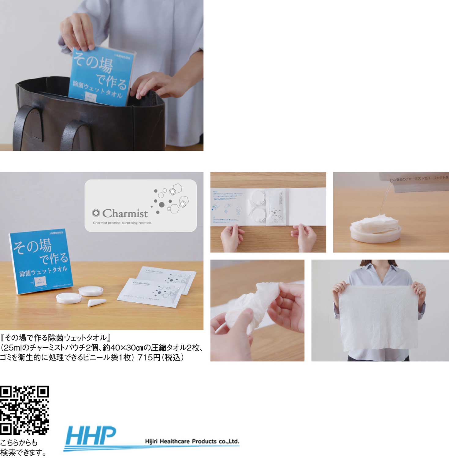使い方は簡単で、圧縮タオルを取り出し、チャーミストを注ぐだけで瞬時にウェットタオルが完成。CDアルバムサイズのコンパクトなパッケージはバッグや防災リュックにもすっきり収まる。「第4回防災グッズ大賞・衛生用品部門」優秀賞を受賞するなど、信頼性も折り紙付き。水が使えない状況でも清拭・除菌ができる実用性の高い逸品だ。