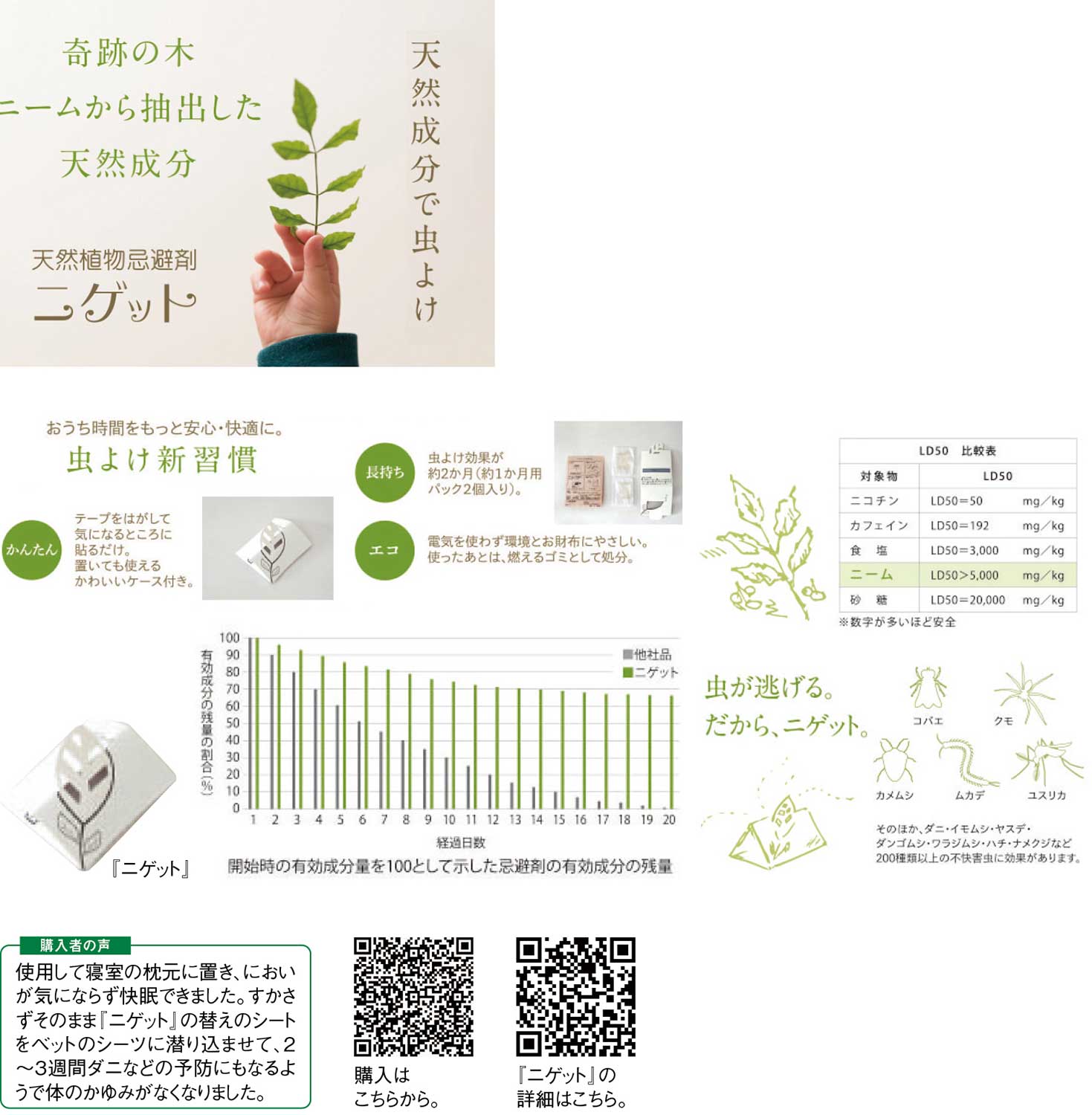 『株式会社テクノリーフ』の害虫忌避剤『ニゲット』の主成分は、南アジアやアフリカに自生し、古くから薬効が知られてきた奇跡の木「ニーム」由来の天然成分。虫を殺すのではなく、虫が本能的に嫌う成分を空間に広げることで、近寄らせないという考え方に基づいている。数種の植物性成分を独自技術で揮発させることで、劣化しにくく、安定した忌避効果を約1カ月間持続させる点も特長だ。化学殺虫成分を使わないため、赤ちゃんやペットのいる家庭でも使いやすく、使用後は燃えるゴミとして処分できる手軽さも安心材料の一つ。カメムシやダニ、ムカデ、クモなど200種以上の不快害虫に対して有効性が確認されている。人への安全性と、確かな忌避力。その両立こそが『ニゲット』の最大の価値といえる。