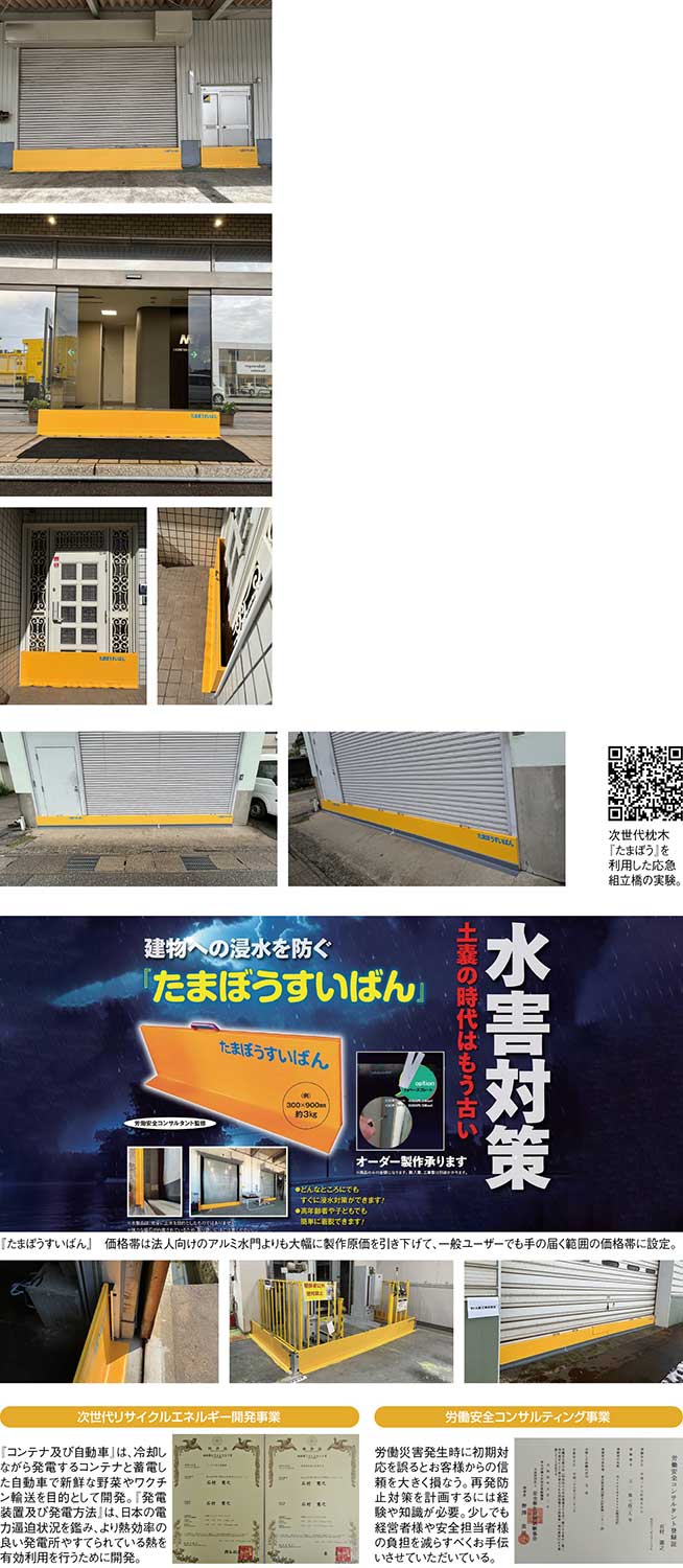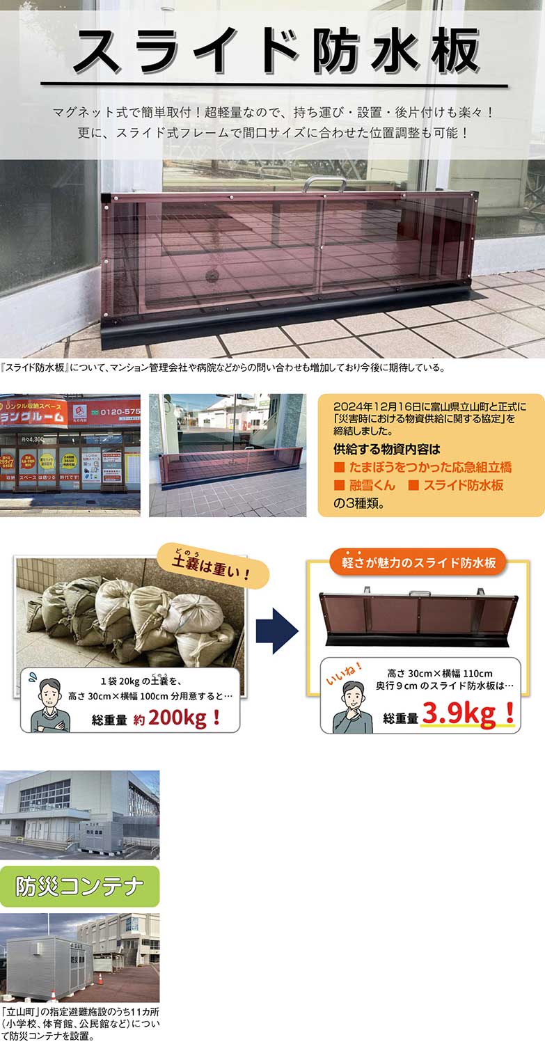 もちろん、堤防が決壊するほどの大規模な洪水は個人の力で防ぐことは難しいが、河川の水害についても浸水深が数十センチ~1メートル程度までの小規模な越水のケースでは、『たまぼうすいばん』や『スライド防水板』の設置で床上浸水を防ぎ、家財道具を守ることができる。一般住宅でも自然災害による浸水対策を考えるケースが増えるなかで、企業にとっても自然災害による損害を最小限に抑えるためのBCP(事業継続計画)対策が急務となっており、「被害が起きる前にどれだけ備えられるか」が問われている。