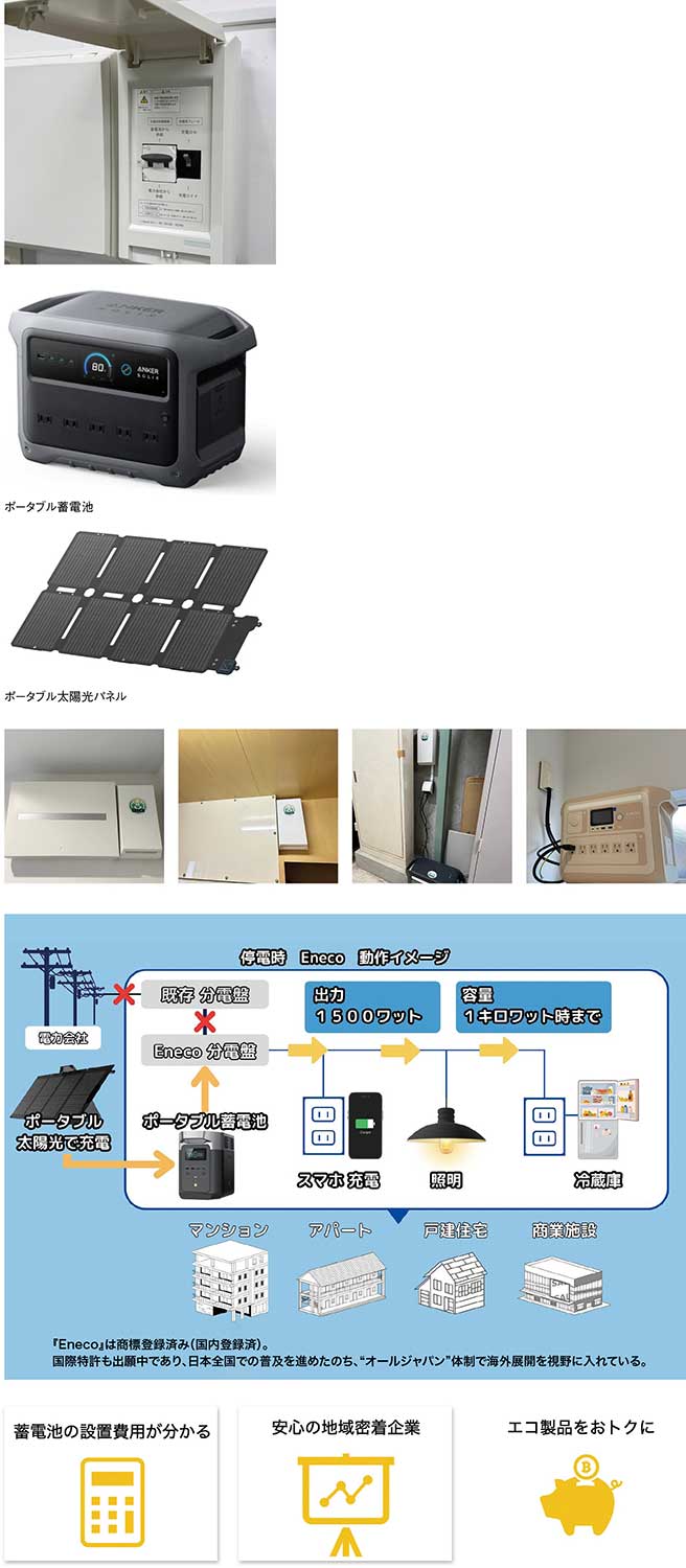 災害時の「電力確保」という課題に真正面から向き合った『Eneco』は、家庭用蓄電池と太陽光パネル、分電盤への接続工事(マンション対応)を一体化したシステム。停電時にはポータブル電源を家庭の電気回路に直接接続し、室内のコンセントを通じて普段と同じように家電を使えるという、従来にはなかった仕組みを実現している。2025年2月に特許を取得した「後付け停電対策セット」をベースに開発されたという。