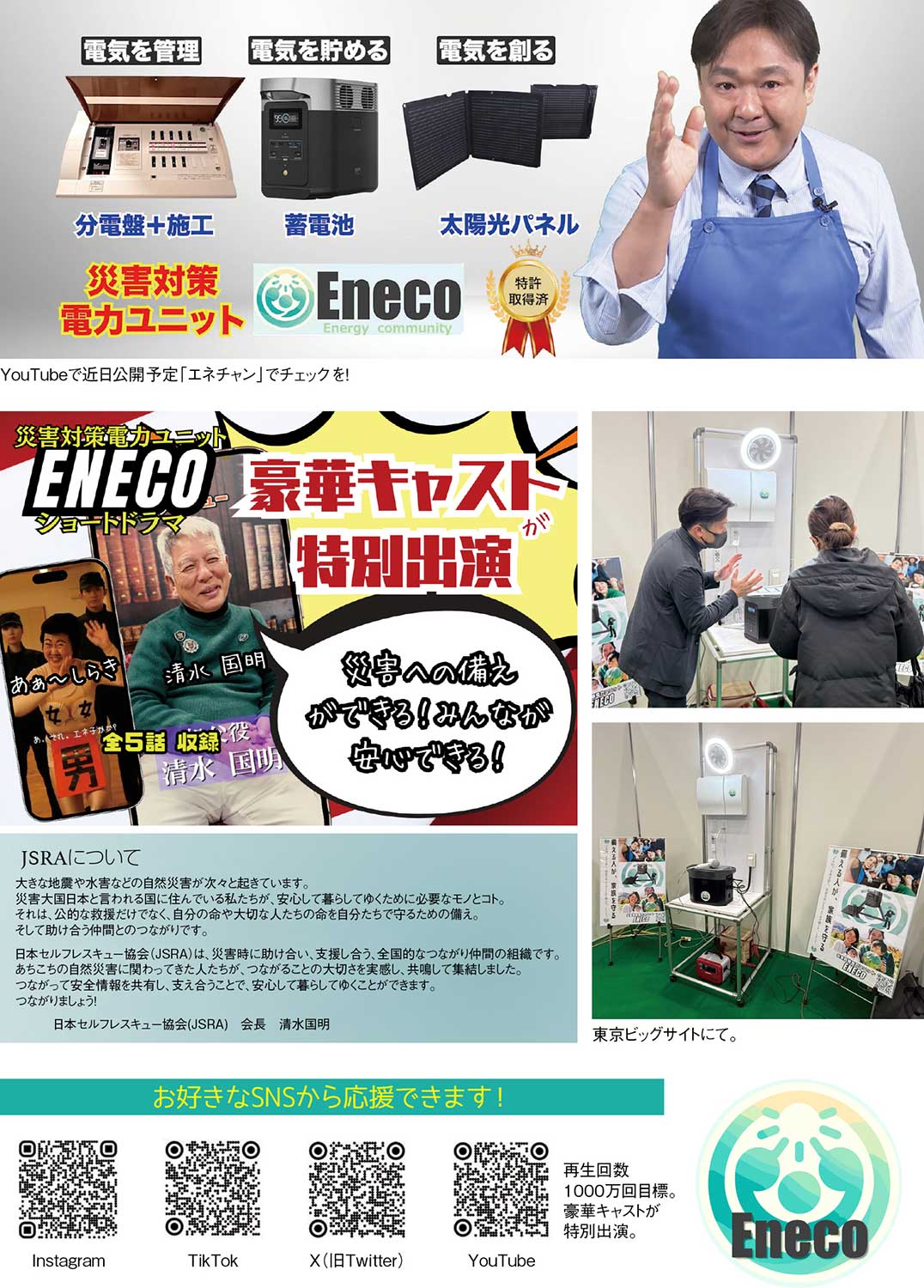 こうした動きの中で、『Eneco』の有効性に大きく注目しているのが、フォークデュオ「あのねのね」で大活躍し、復興支援に乗り出したタレント清水国明さん。「日本セルフレスキュー協会」を立ち上げた清水さんは、阪神淡路大震災や東日本大震災を機に被災地に足を運び、ボランティア活動に参加。その経験を通じて災害対策の重要性を痛感し、もっと自分にできることはないかと考え、活動を開始。災害対策の重要性を訴え続けている。