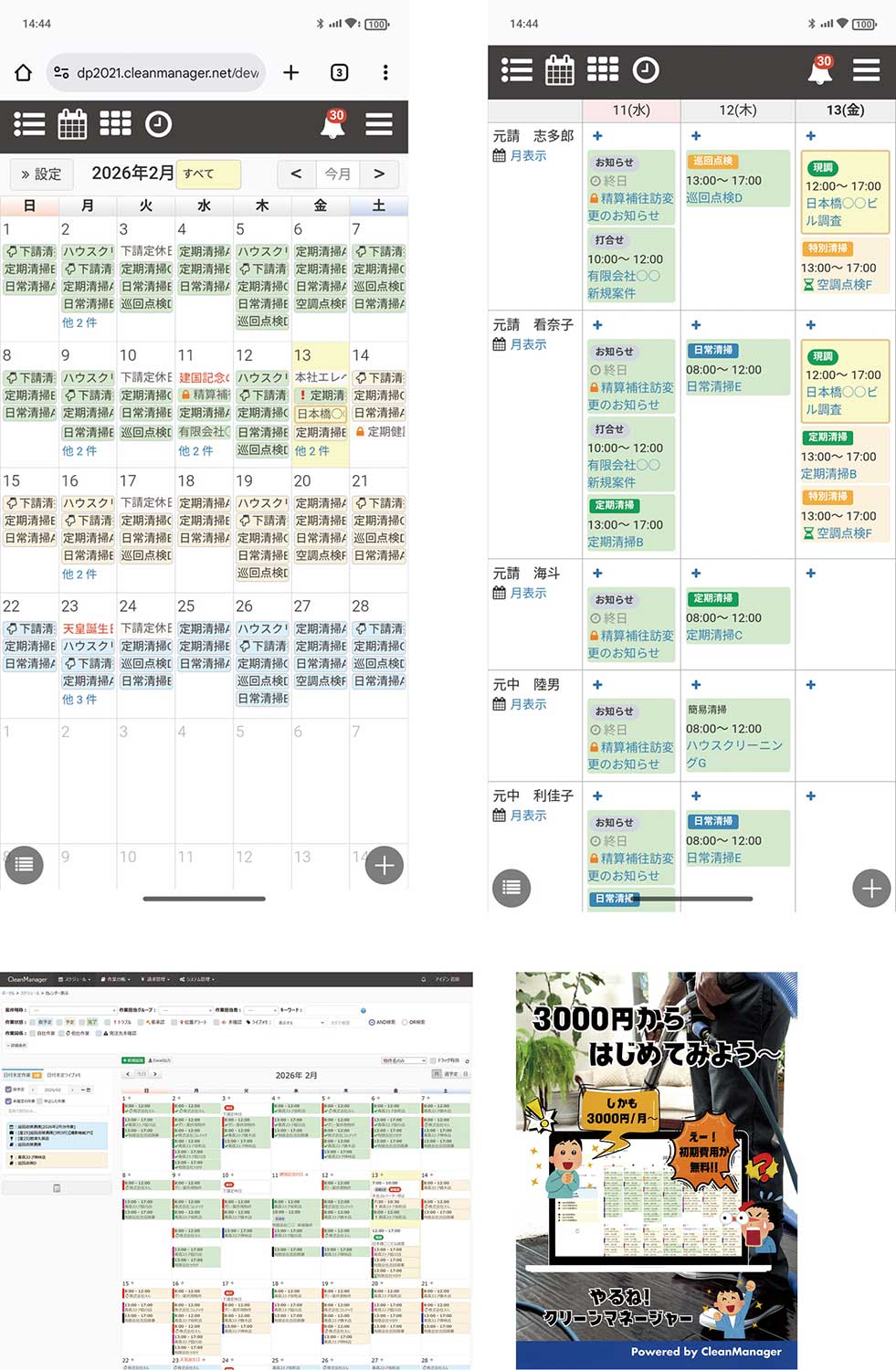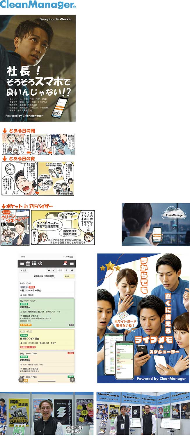 最近は「パソコンを開く仕事」が減っている。連絡、撮影、共有、承認はスマホで完結する場面が増えた。クリーンマネージャーも、現場の動線に合わせてスマホで多くの管理業務をできるようにしている。現場で撮影した写真をアップロードし、報告を残し、関係者がリアルタイムに状況を把握する。机に戻って〝まとめて処理〟する前提を減らすことで、現場と管理のズレを小さくする。