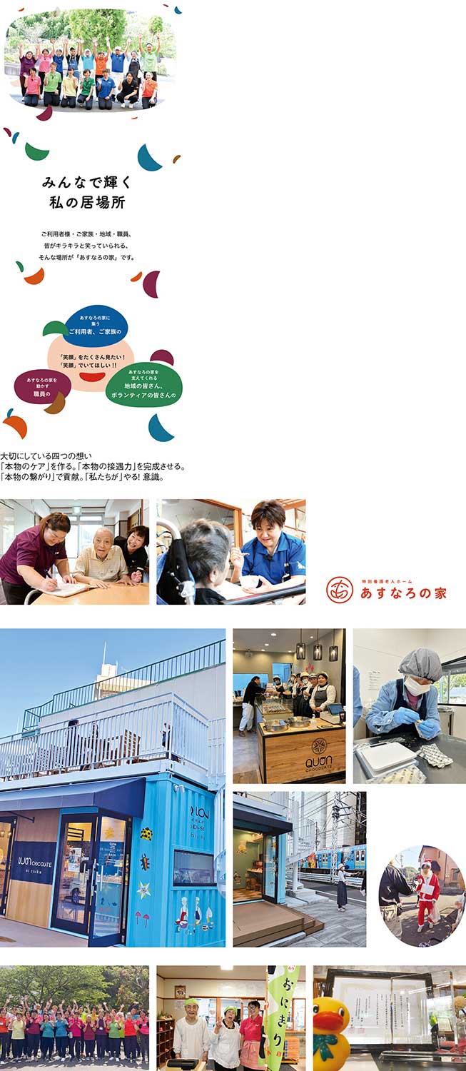 『あすなろの家』が大切にしてきたのは、「本物の接遇力」「本物のケア」「本物の繋がり」、そして「私たちがやる」という主体性だ。外出行事やイベント、ウォークラリー、「おSHIGOTOデイ」といった取り組みは、単なるレクリエーションではなく、利用者が社会と接点を持ち続けるための仕掛けでもある。介護を〝守り〟に閉じないという姿勢が、ここには一貫してある。そうした積み重ねの先に生まれたのが、チョコレート事業への参加だ。全国に広がる「QUONチョコレート」は、障がいのある人をはじめ、多様な背景を持つ人が誇りを持って働ける場をつくることを理念とし、フェアトレードのカカオを使った高品質なチョコレートで評価を高めてきた。 介護の現場で培ってきたのは、人の力を引き出し、役割をつくり続けていくノウハウだ。その知見を、今度は仕事という形で地域に開く。チョコレート工房は、新たな就労の場であると同時に、地域とつながる窓口にもなる。甘い香りの向こう側には、働く誇りと対価がきちんと循環する仕組みがある。高齢者の暮らしを支える介護、働く場を生み出す就労、そして地域経済。これらを一つの線で結び直すこと。『あすなろの家』がチョコレート事業に参加した理由は、決して突飛な挑戦ではない。ここで育まれてきた開かれた介護の延長線上に、自然と現れた次の一手だ。