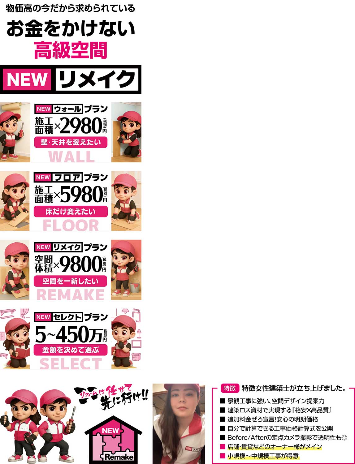 大阪市北から神戸市を拠点に、店舗や賃貸、住宅の「景観リフォーム」を得意とする『株式会社NEWリメイク』。創業は2025年7月と新しいが、創業者が8年間現場で培ってきた経験と技術を背景に、仕上がりの質を落とすことなくコストを抑える独自の施工スタイルを確立している。必要な工程を的確に見極め、無駄な工事を徹底的に省く姿勢で、予算や用途、物件の状況に応じた柔軟なプラン提案により、短期間・低料金でのリフォームを実現。契約後の追加料金は絶対0円とする明朗会計も依頼者の不安を取り除く要素だ。工期はプレキャスト(事前加工)を採用しているため、現地での騒音や粉塵被害を縮小するとともに、工事期間の短縮を実現。スピーディーで、営業を止めにくい店舗や入退去のタイミングがシビアな賃貸物件にも対応。壁紙の張替えや部分補修といった小規模案件から、空間全体の印象を刷新するリフォームまで幅広く手がける。