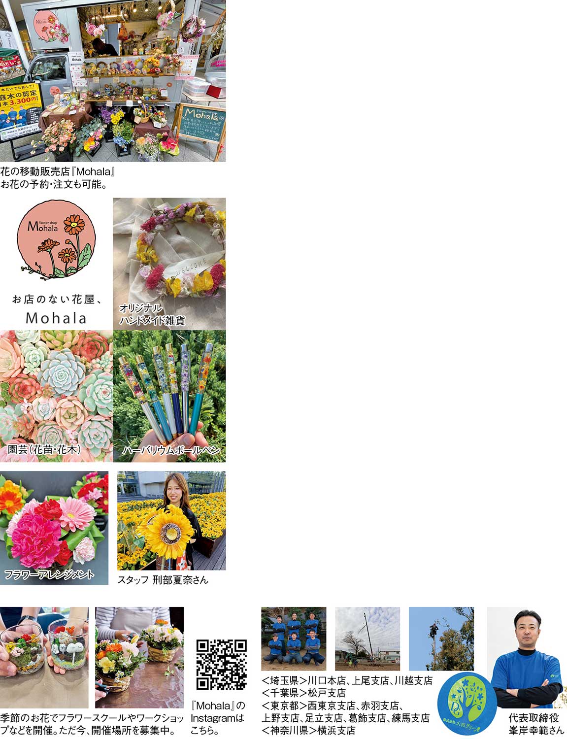 埼玉県を拠点に、植木と花の両面から暮らしに彩りを届ける『株式会社大和グリーン』。樹木医とグリーンアドバイザーの資格を持つ代表の峯岸幸範さんは、剪定や伐採、植栽管理などを担う植木屋さん。高齢者家庭で手が回らない庭の困りごとなどにも丁寧に対応し、「頼れる植木屋さん」として親しまれている。「フラワーカー」として、『Mohala(モハラ)』という移動販売花店も活動。週5日、埼玉と東京の数カ所を周り、季節の草花や観葉植物、ドライフラワー、花苗、花木、園芸雑貨やオリジナルのハンドメイド雑貨など幅広いアイテムを展示販売。相談を受ければ、花の飾り方や育て方、観葉植物の手入れ、魅力を引き出す配置、苗の植え方などもアドバイスする。かき氷や綿菓子なども販売し、子どもたちからも大好評。現在フラワースクールやワークショップを各地にて開催中! スケジュールは、Instagramで確認を。